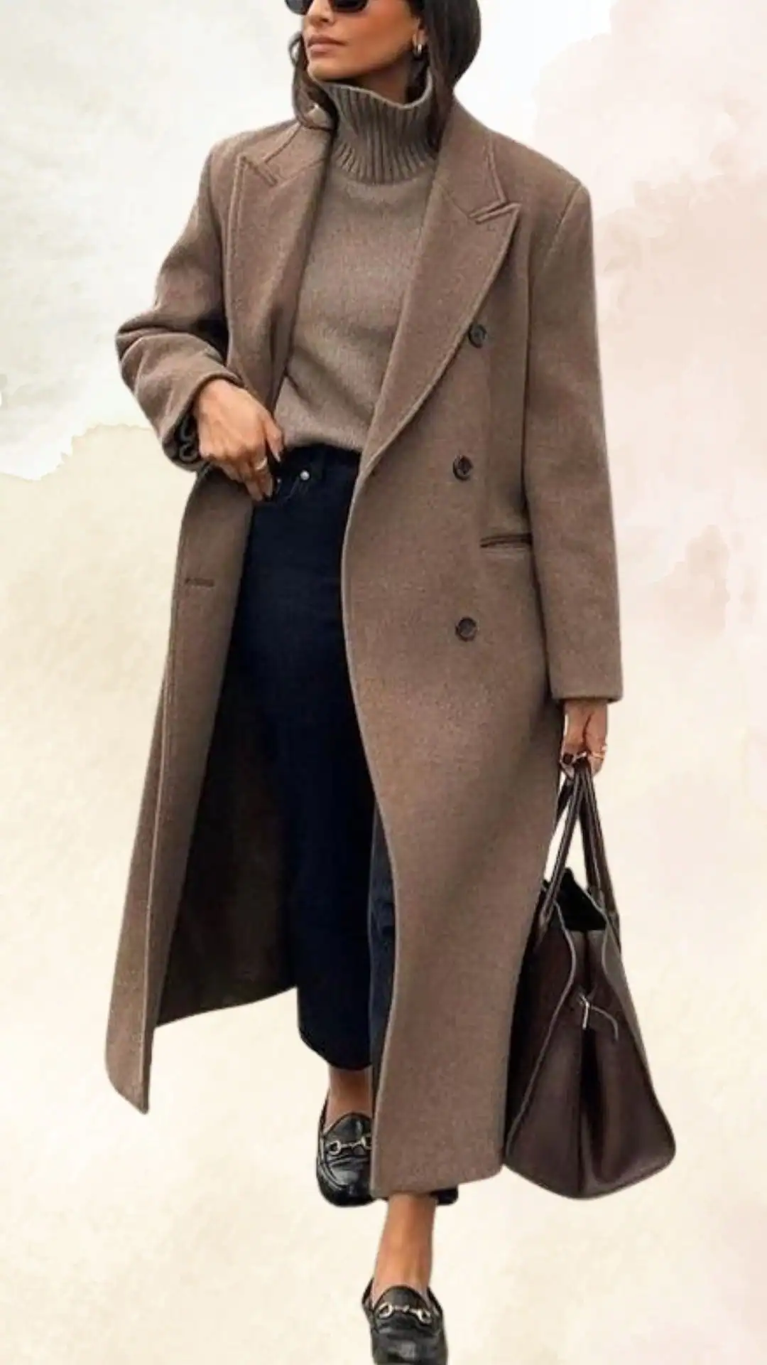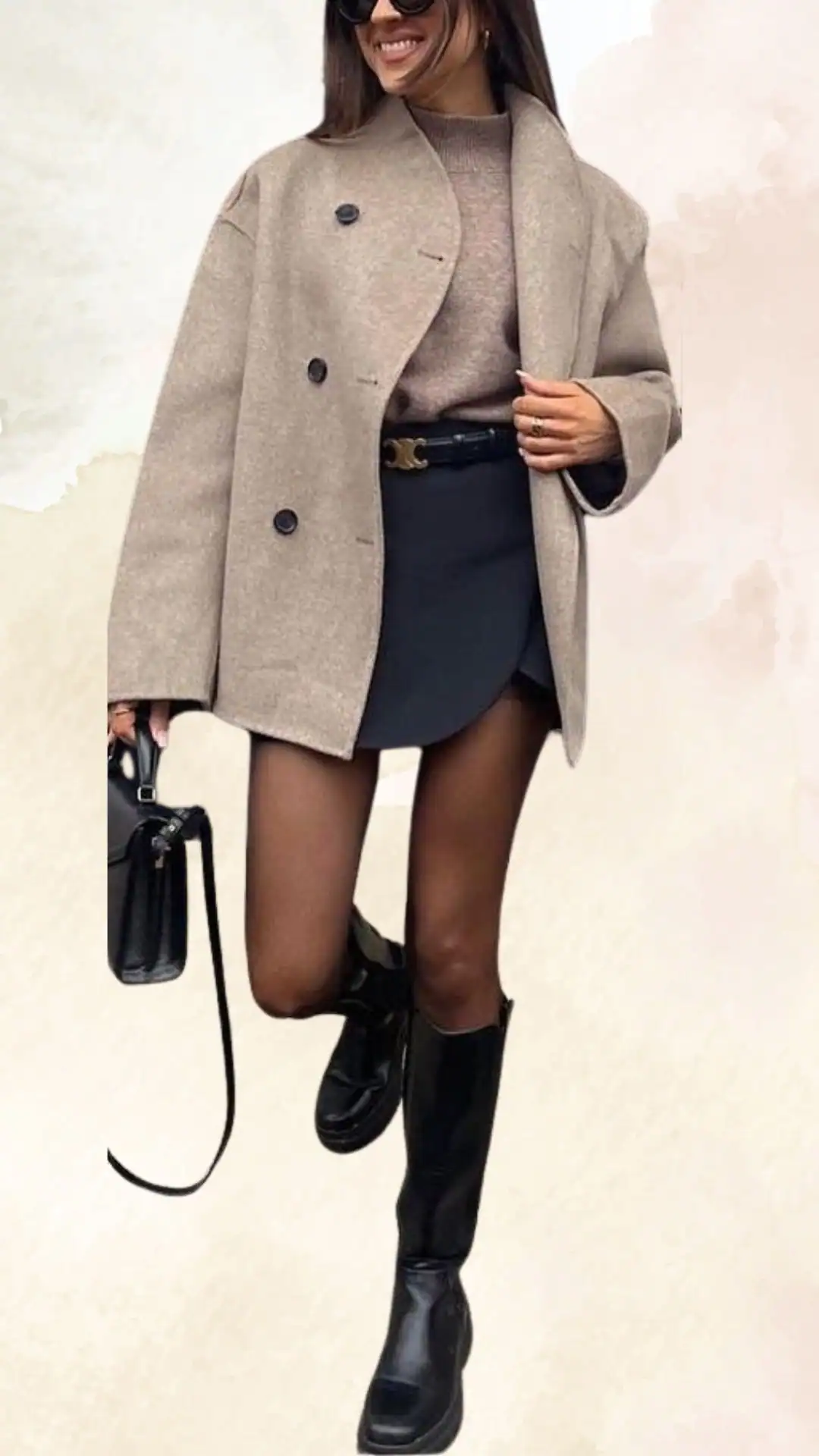 This chic fall ensemble showcases a cozy, light brown oversized wool coat featuring a trendy double-breasted design.