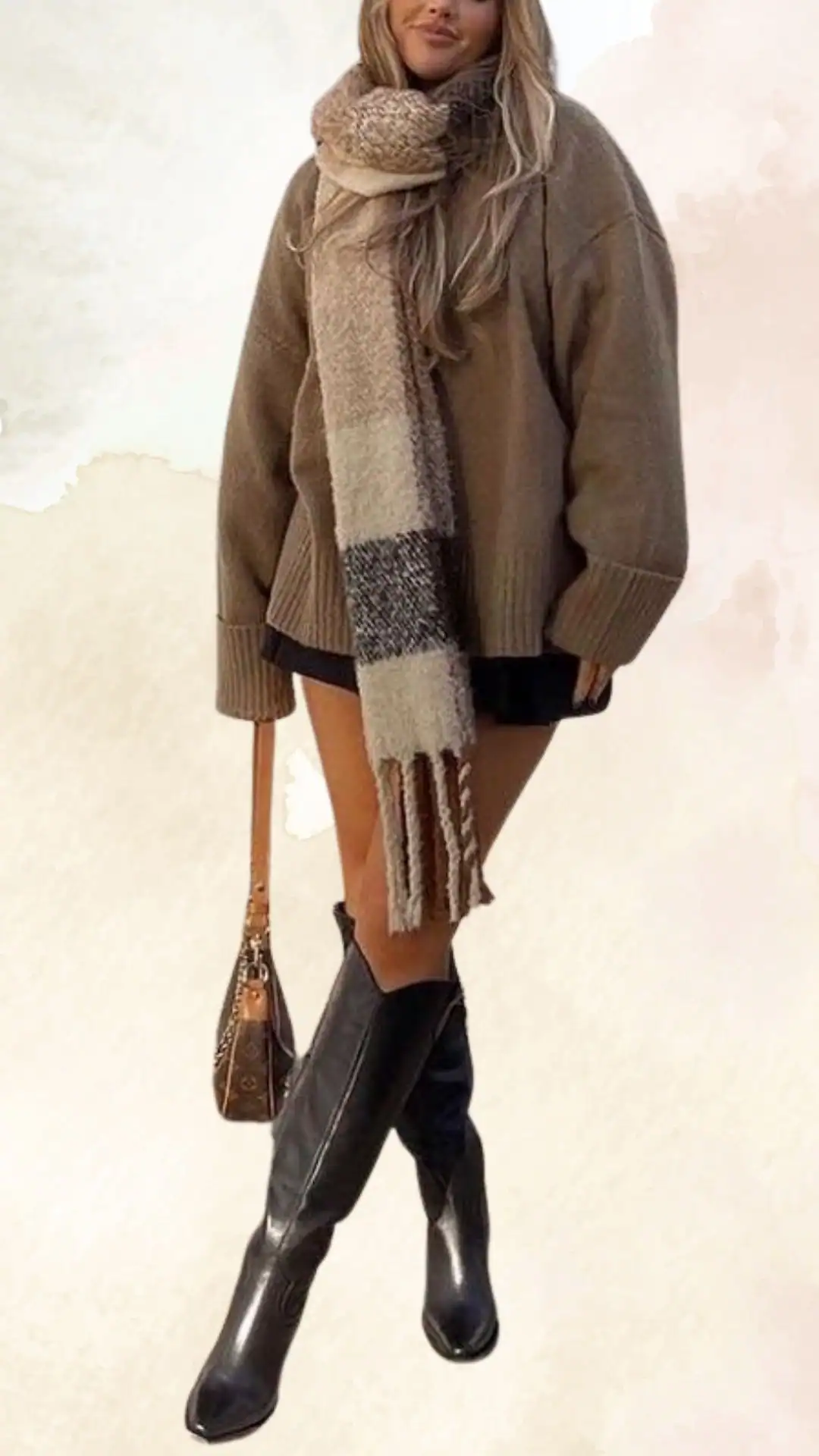 This stylish ensemble features an oversized taupe sweater, perfect for layering on brisk fall days.