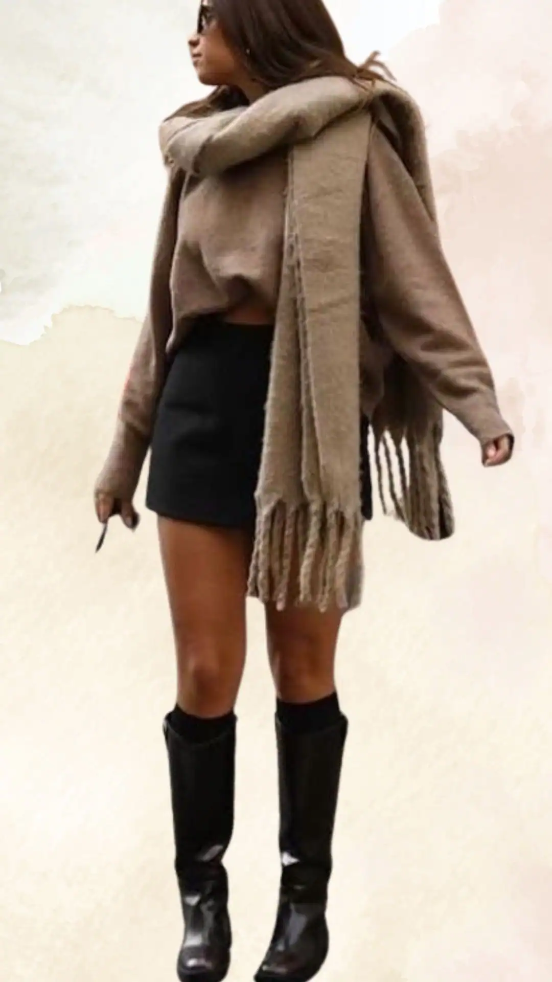 Sleek black ankle boots add a chic edge, while a rich brown scarf introduces a pop of color, enhancing the overall aesthetic.