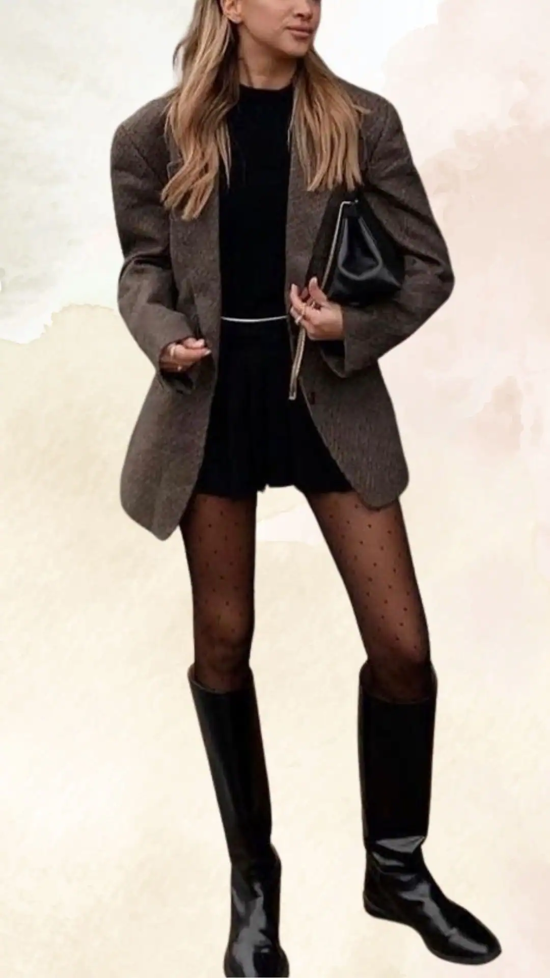 To complete the ensemble, tall, glossy black boots inject an edgy flair, ideal for transitioning from casual outings to evening events.
