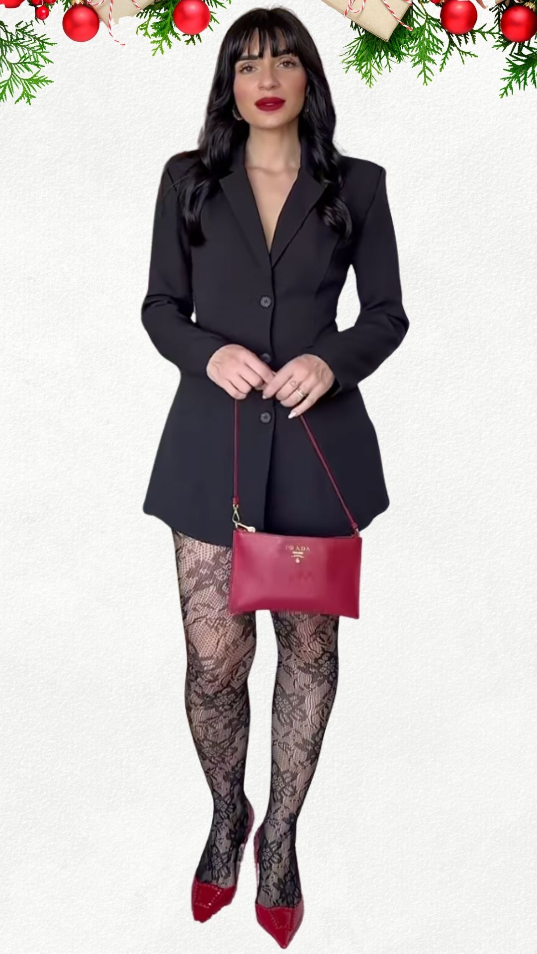 The sheer black lace tights add a touch of sophistication, while vibrant red stiletto heels and a matching Prada handbag bring a lively pop of color that’s both chic and festive.