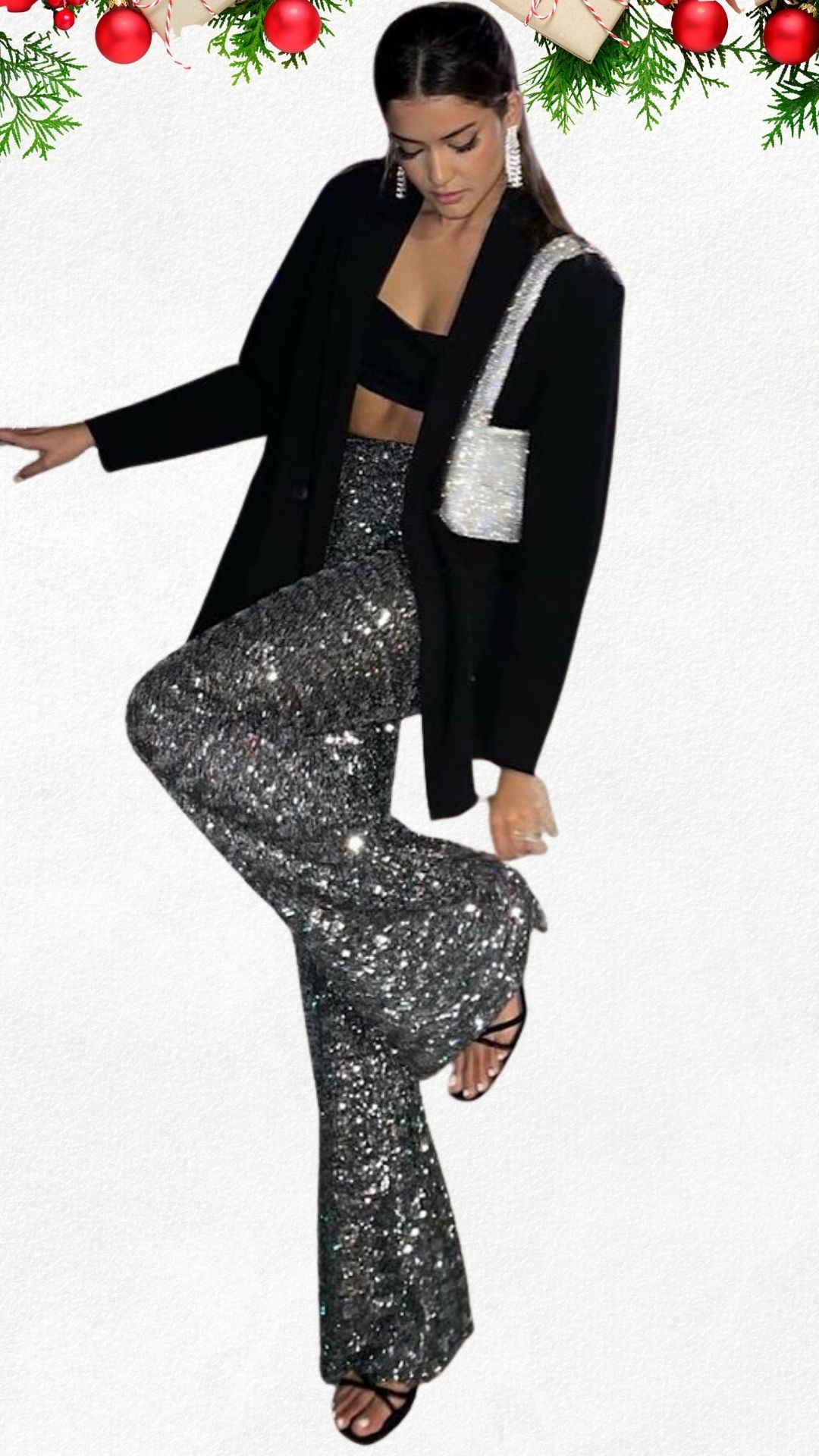 Christmas Party Outfit With Shimmering Silver Sequined Wide-Leg Pants
