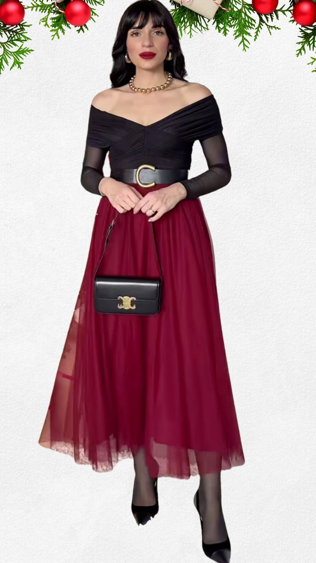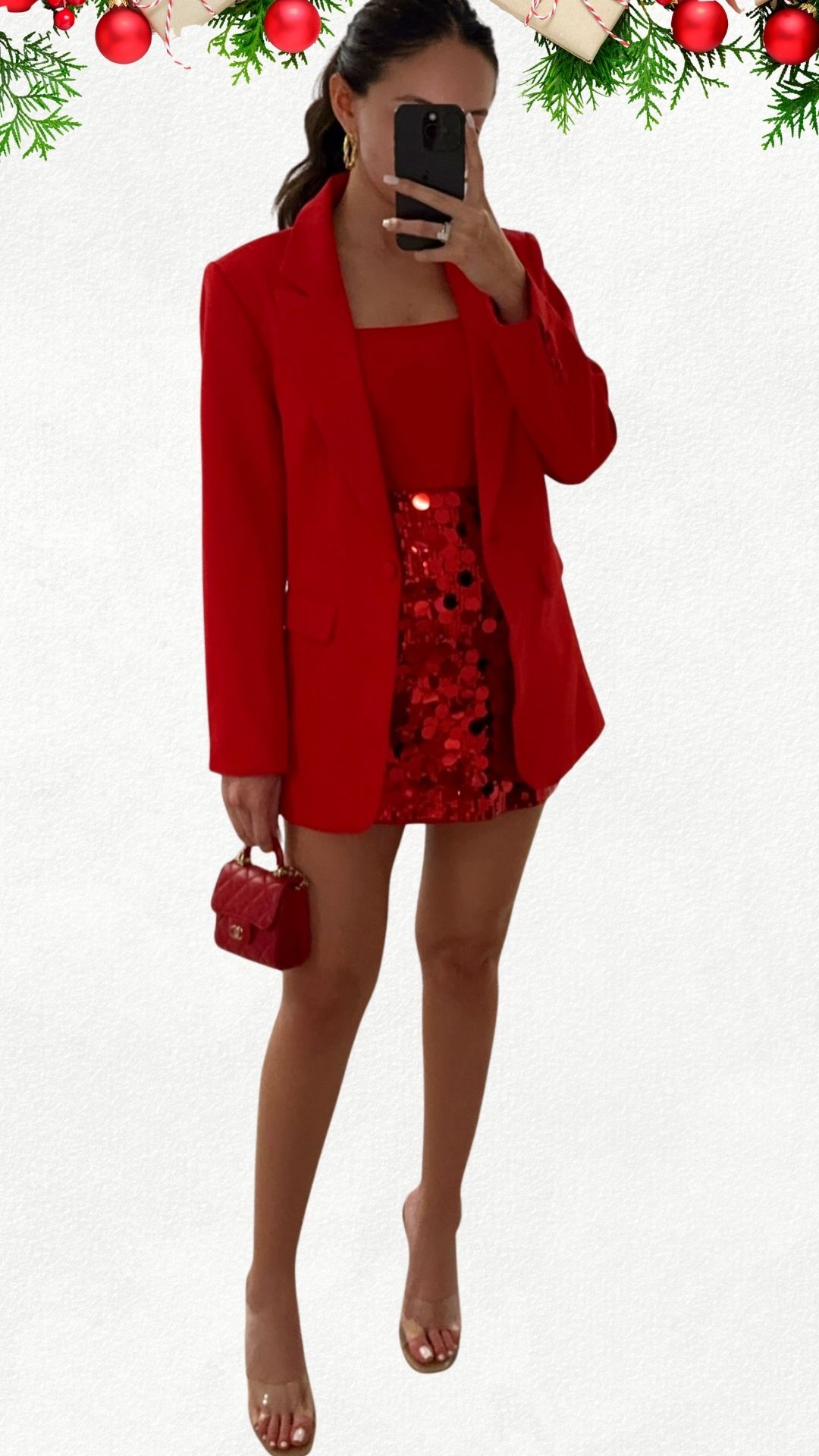 Together, these pieces create a sophisticated yet playful look that captures the spirit of a classy Christmas party.