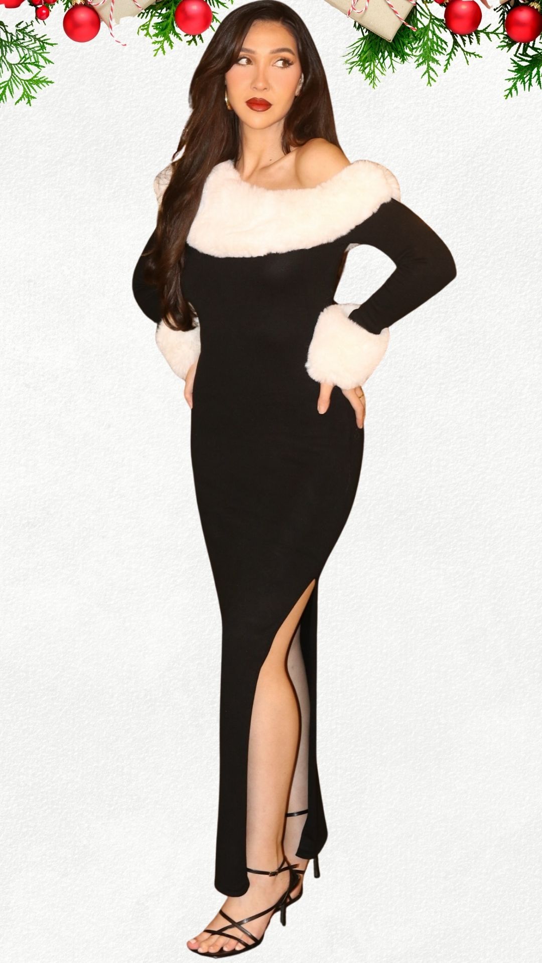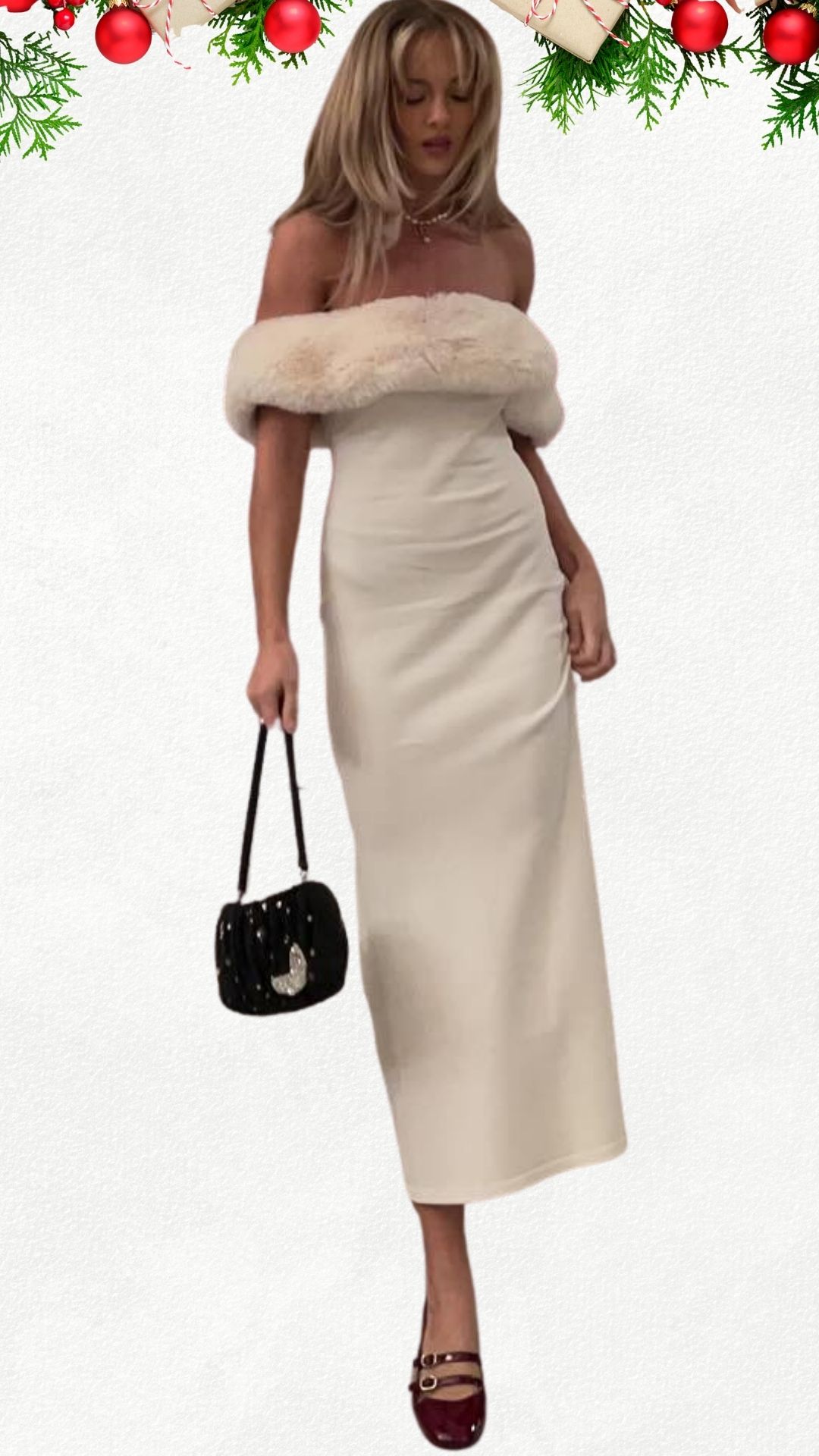 The off-the-shoulder design showcases the neckline, while the luxurious white faux fur trim adds a touch of sophistication.