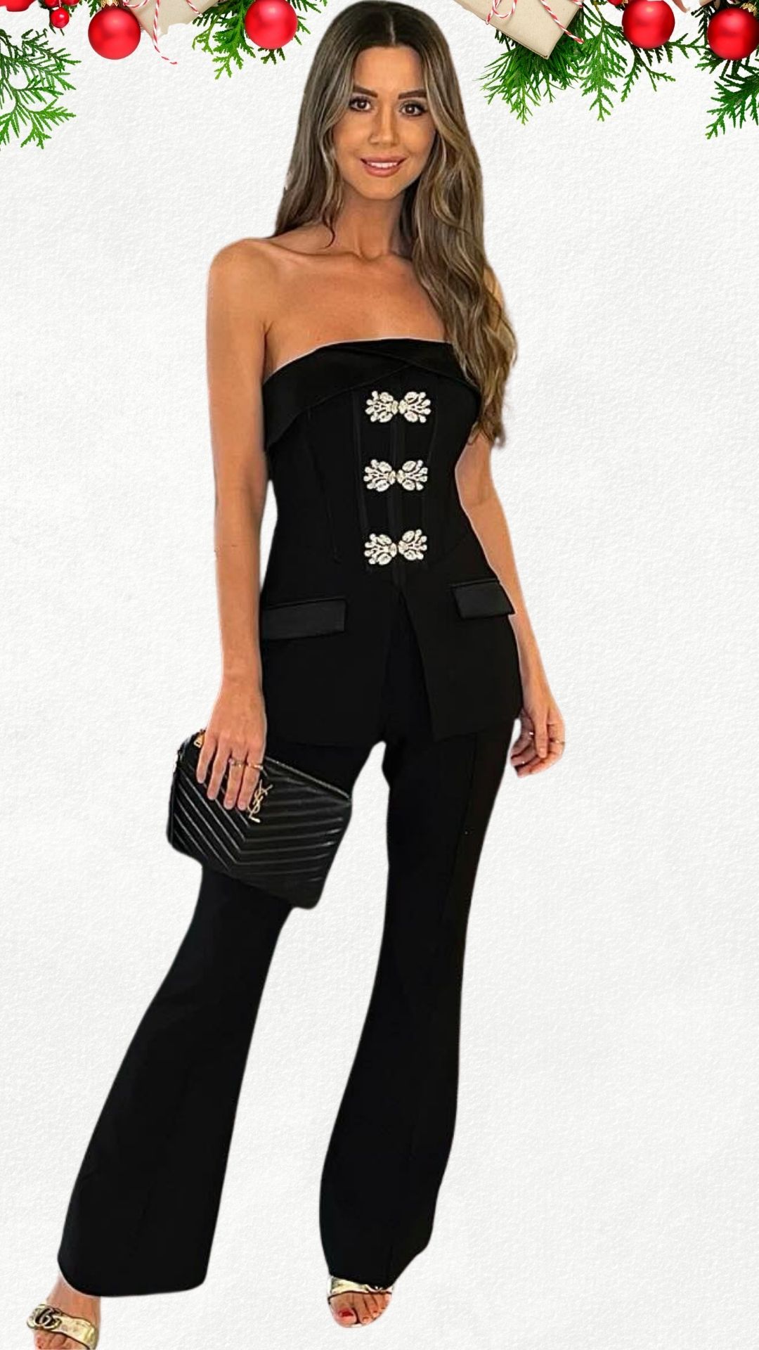 This stunning black strapless jumpsuit features a structured bodice adorned with decorative silver buttons, elevating its sophistication.