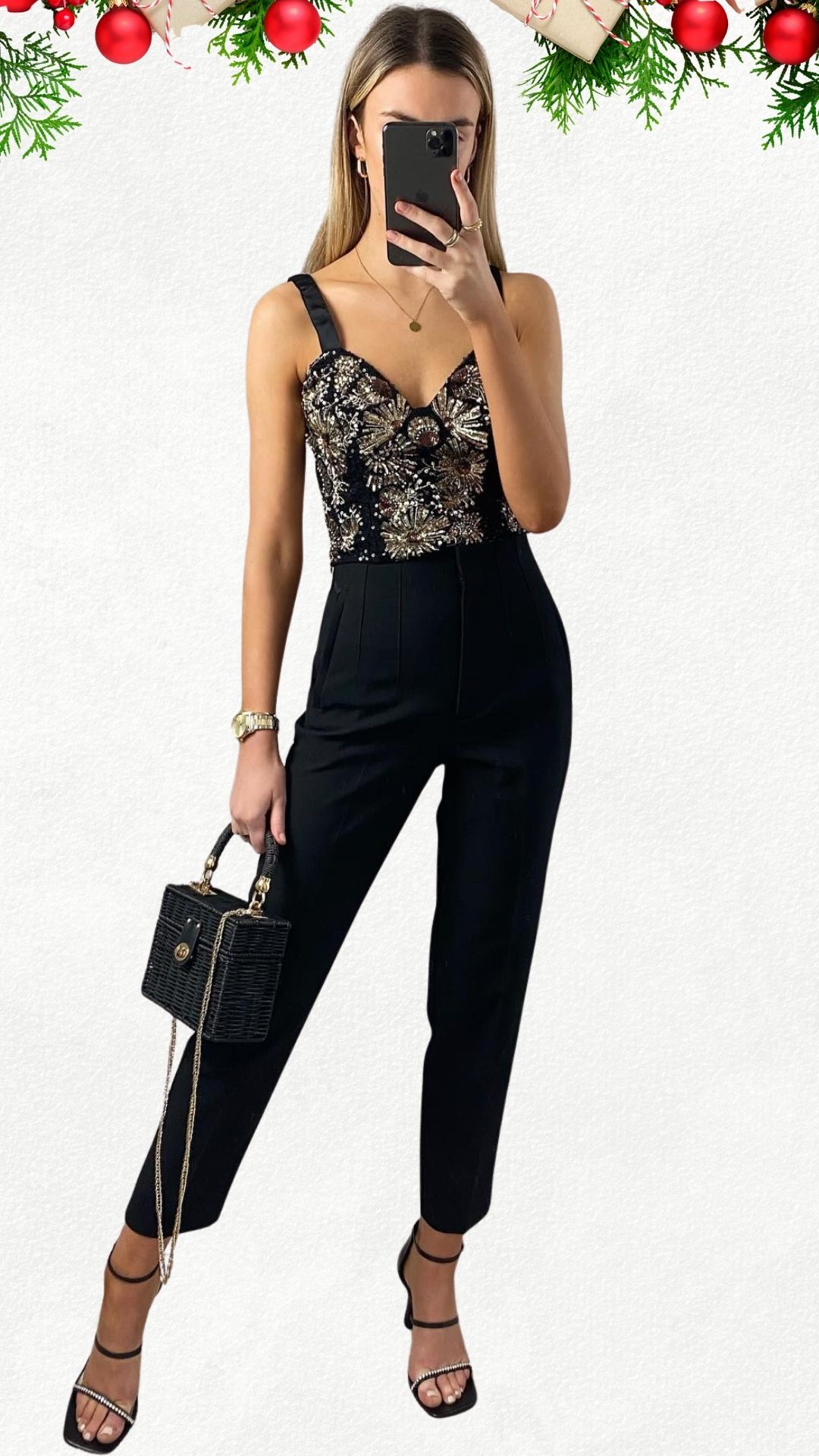 This stunning fitted black jumpsuit is the epitome of elegance for any festive celebration.