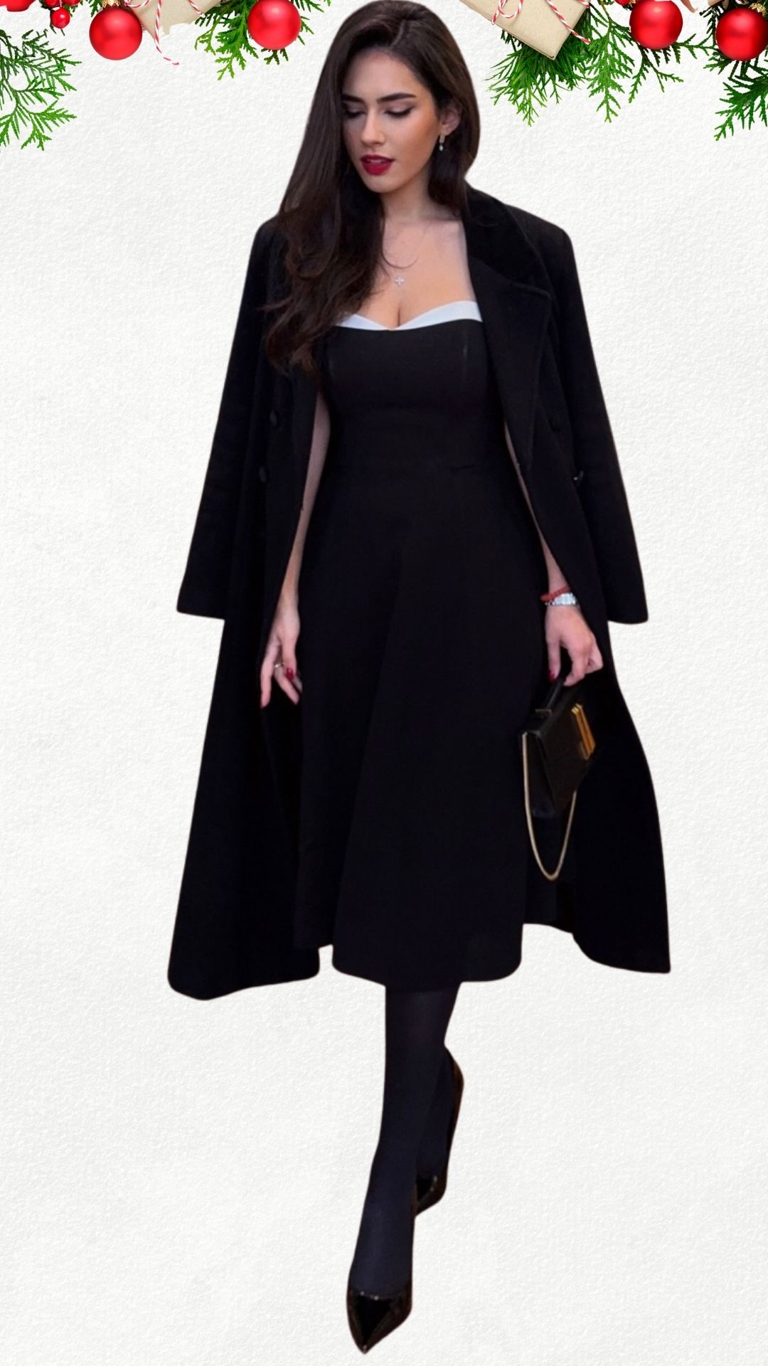 This outfit exudes sophistication with its chic black midi dress featuring a flattering fitted bodice and a flowing flared skirt.