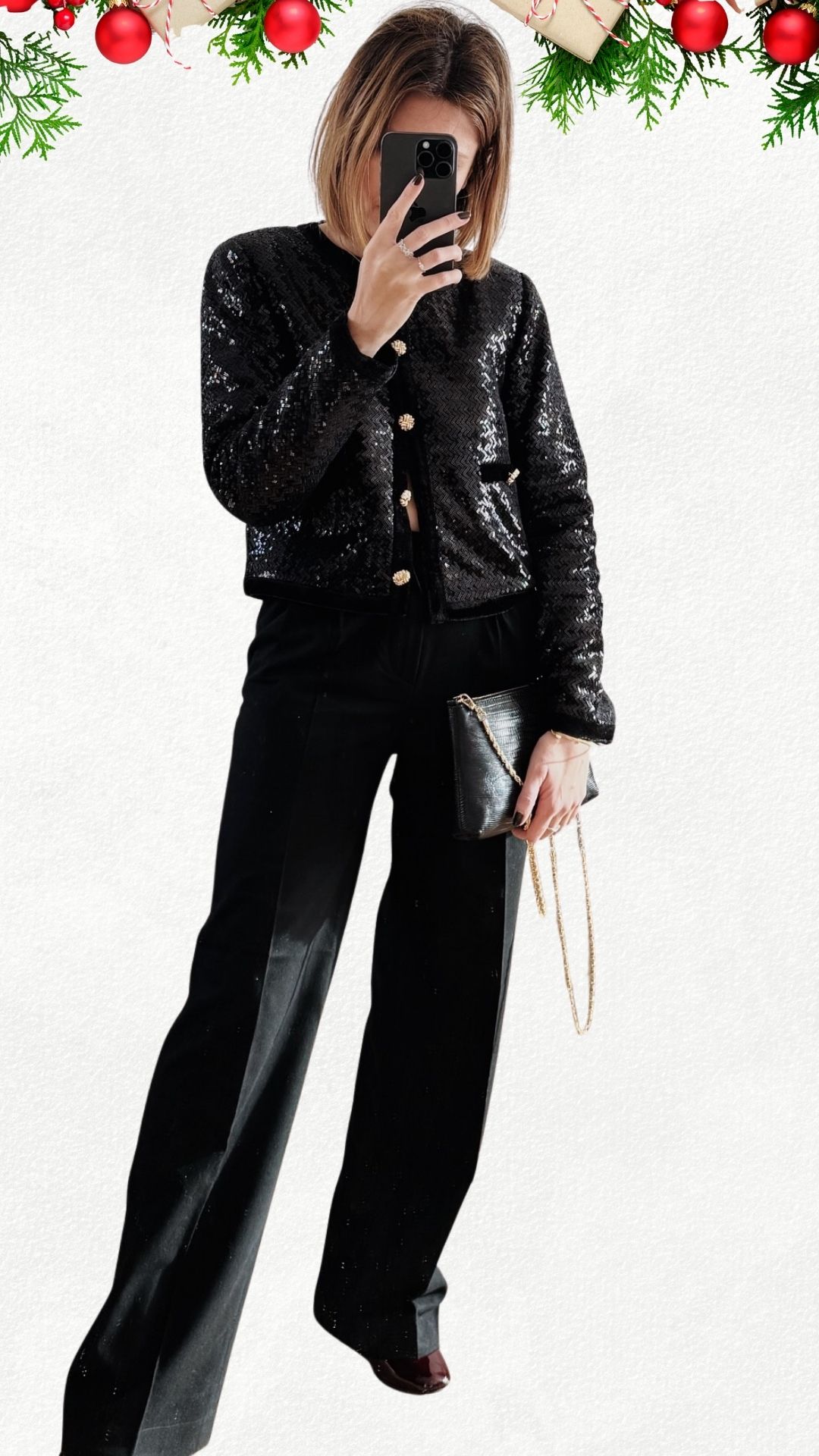 This stunning Christmas party outfit features a sleek fitted black turtleneck layered under a stylish black blazer, exuding sophistication.