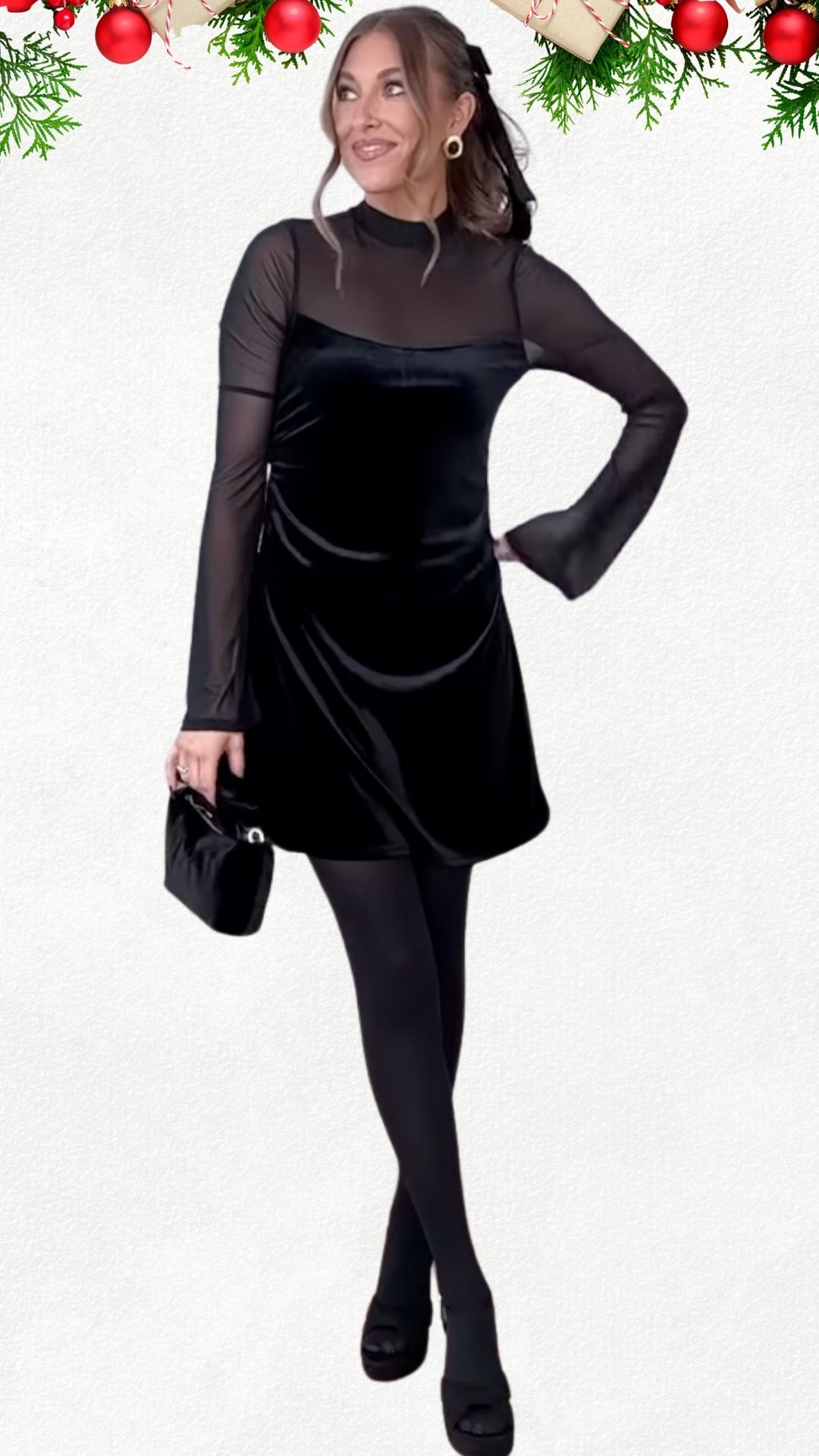 Paired seamlessly with sheer black tights, the outfit exudes sophistication for any dressy Christmas occasion.