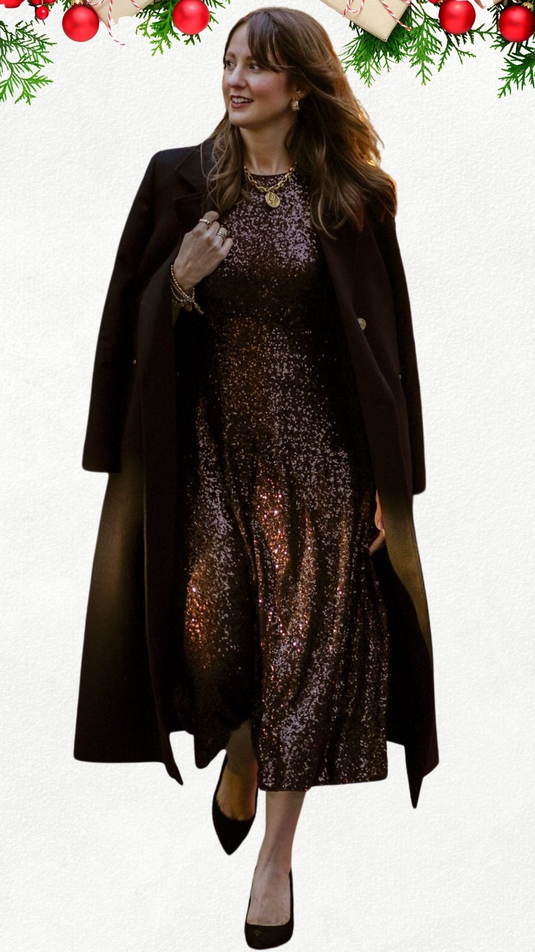 The sleek silhouette is elevated by sheer nude tights and sophisticated black stiletto heels, creating a refined look that’s ideal for any holiday soirée.