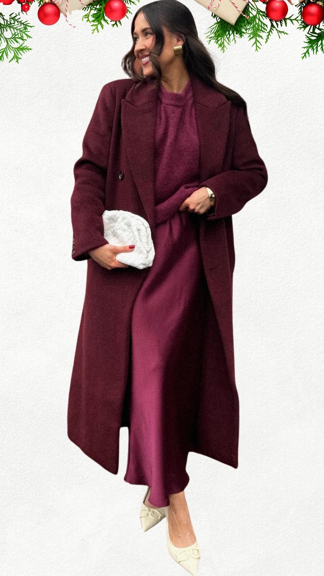 This stunning outfit showcases a long burgundy coat that drapes gracefully over a fitted burgundy sweater, creating a seamless silhouette.