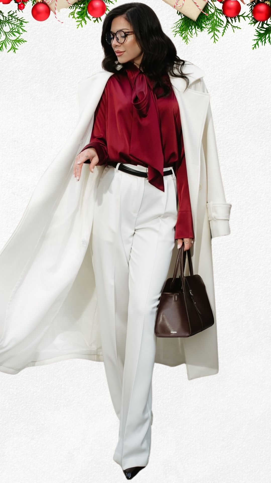 This outfit perfectly balances sophistication and festive flair. The deep burgundy satin blouse, featuring a bow tie neck and long sleeves, radiates elegance.