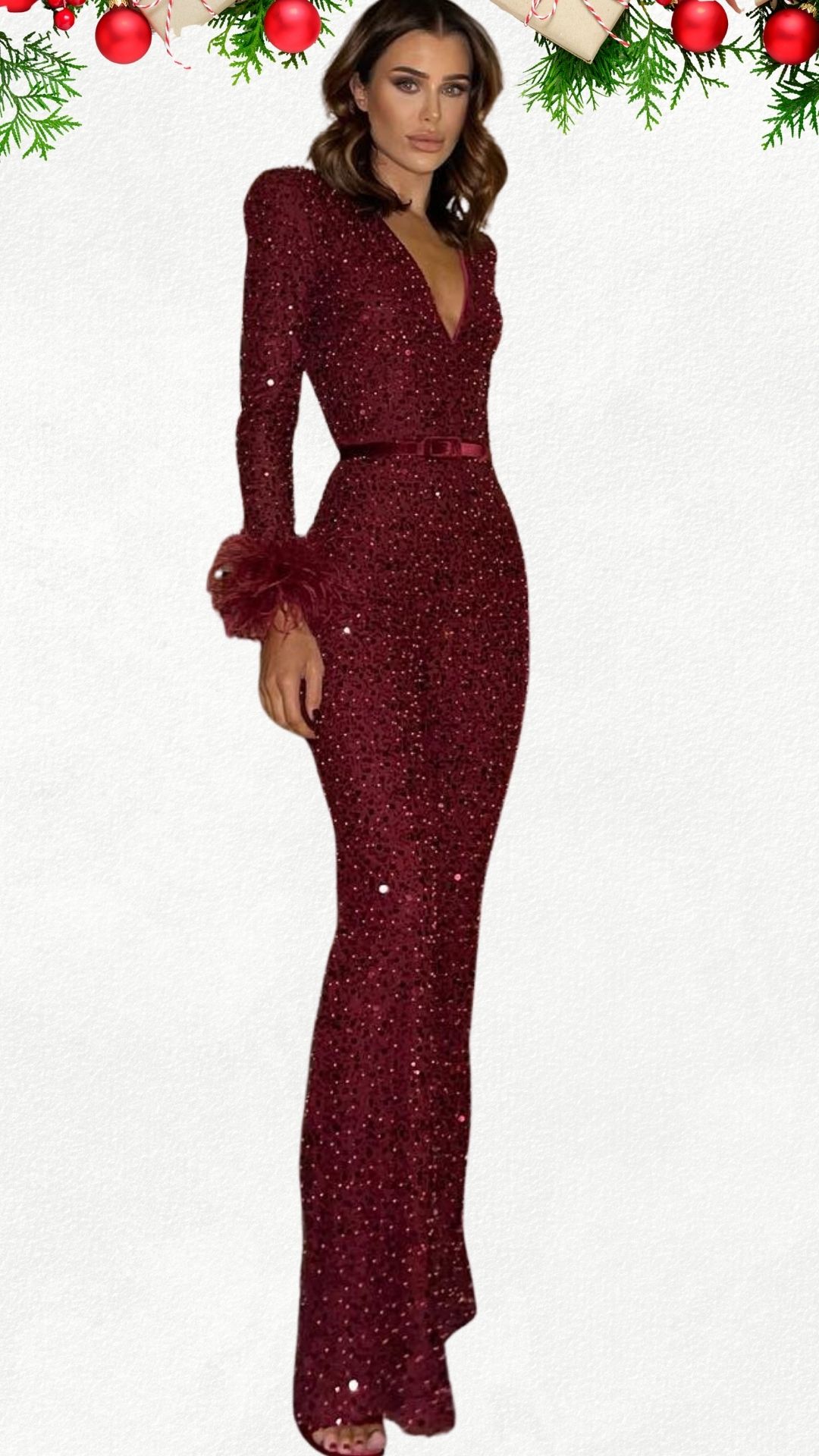 This deep burgundy jumpsuit is a standout choice for any holiday gathering, adorned with luxurious sequins that reflect the festive lights beautifully.