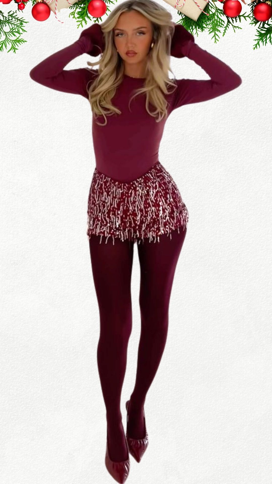 The fitted burgundy long-sleeve top seamlessly complements the glittery, tiered mini skirt, creating a silhouette that’s both festive and elegant.