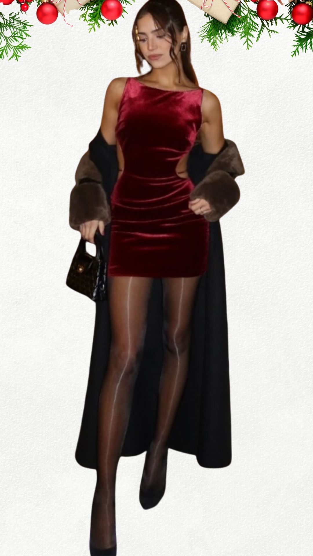 This stunning ensemble features a fitted mini dress, perfectly hugging the body in rich burgundy velvet with striking side cutouts for a contemporary flair.