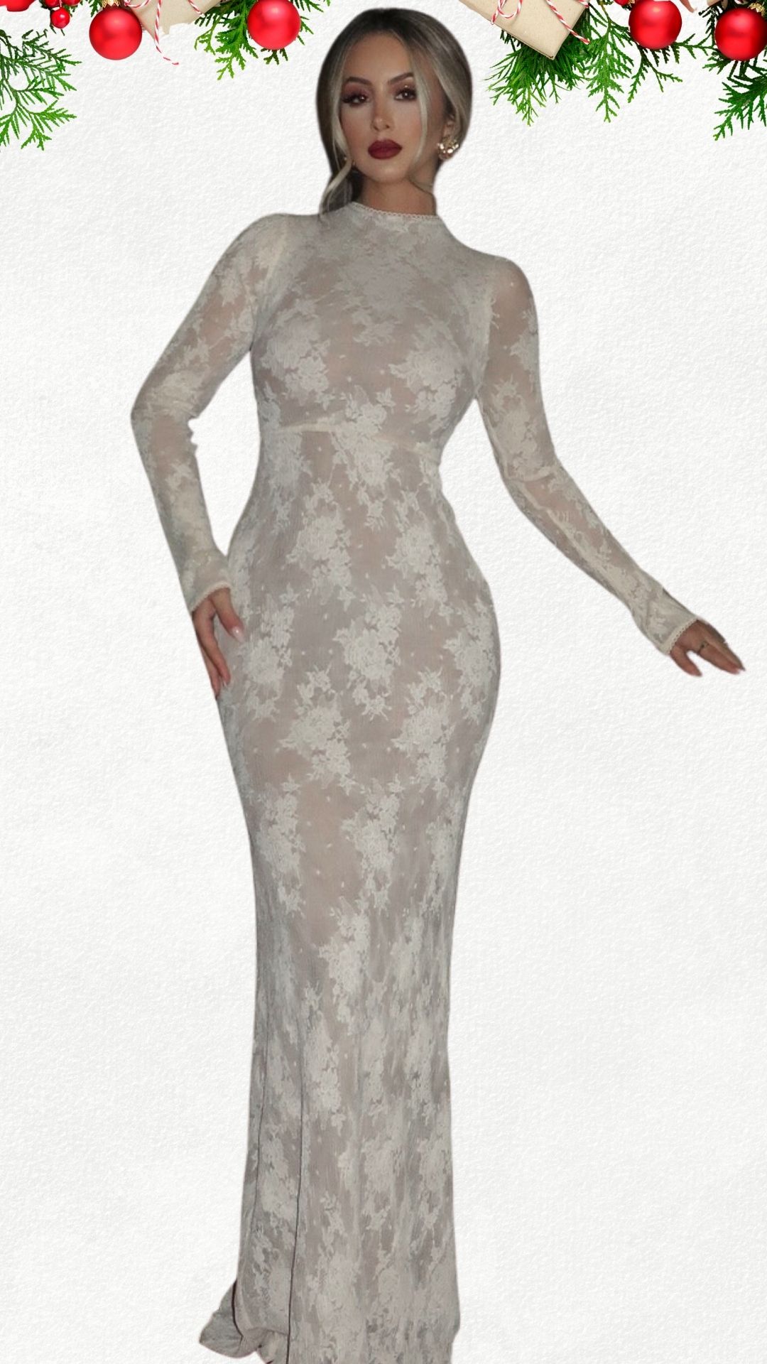 This enchanting floor-length dress showcases exquisite sheer lace in a soft beige tone, intricately decorated with delicate floral patterns.