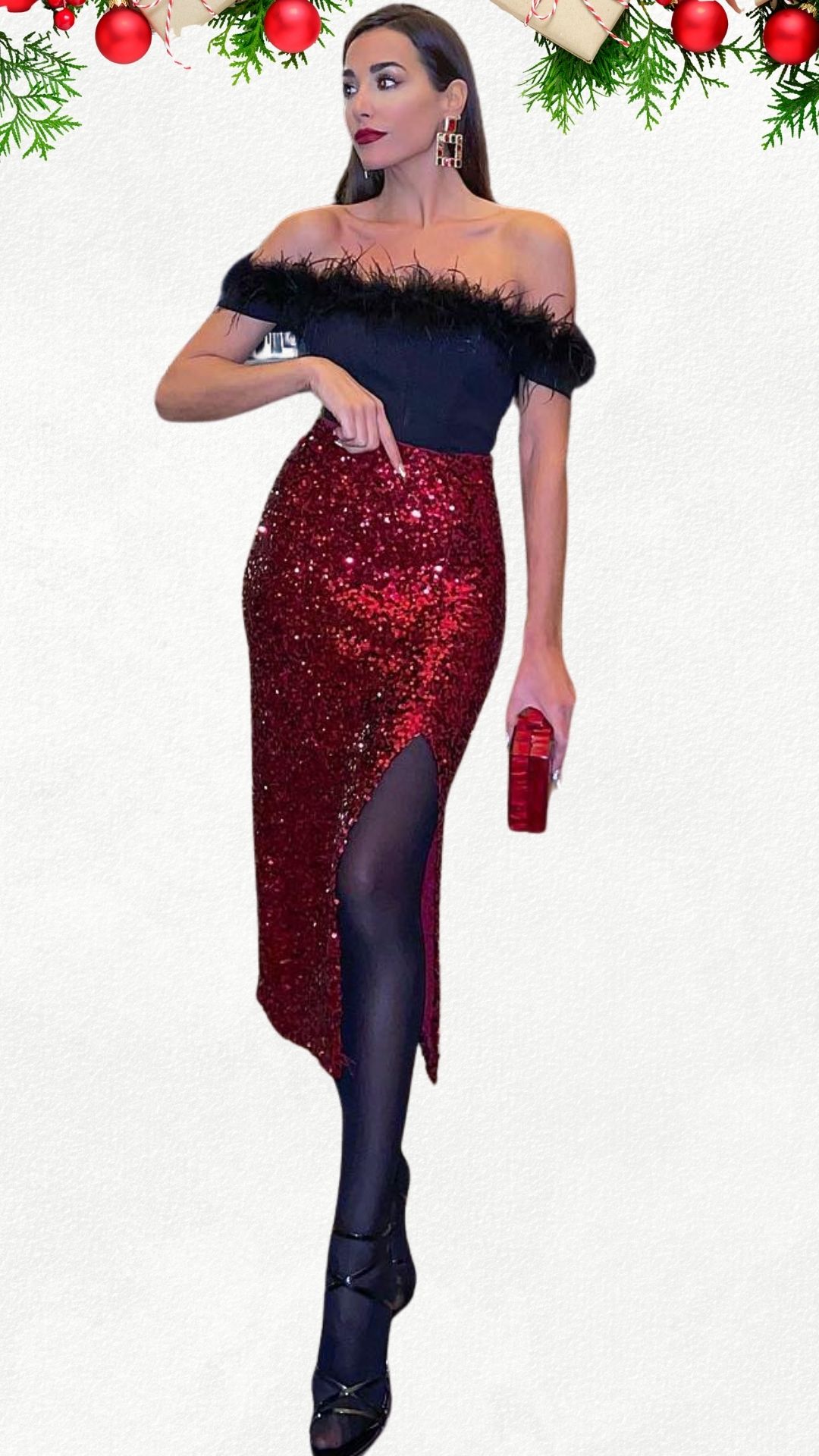 The eye-catching red sequined midi skirt captures the light beautifully, adding a festive sparkle perfect for a chic holiday gathering.