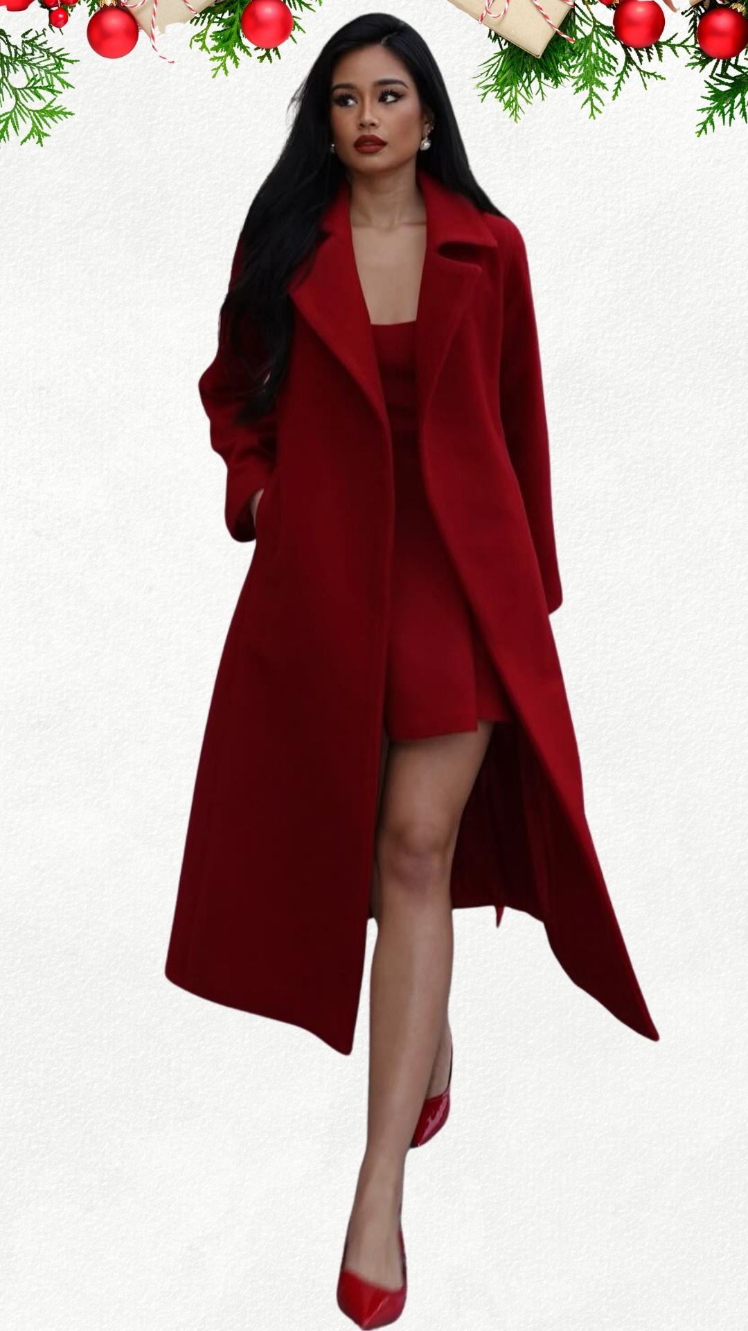 Layered beneath a luxurious long red coat, the combination exudes sophistication and festive charm.