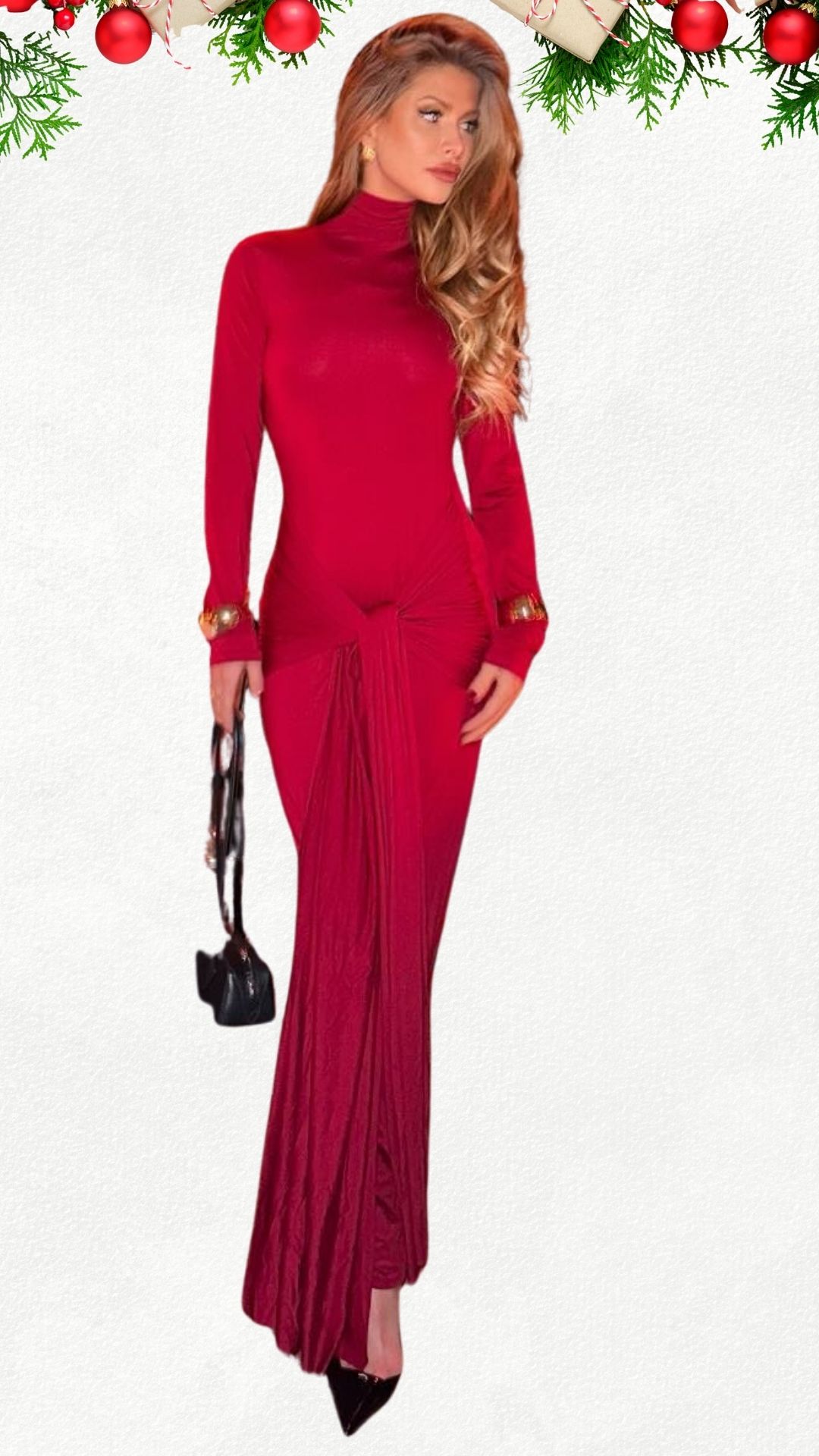This exquisite outfit features a fitted red long-sleeve turtleneck that elegantly embraces the silhouette.