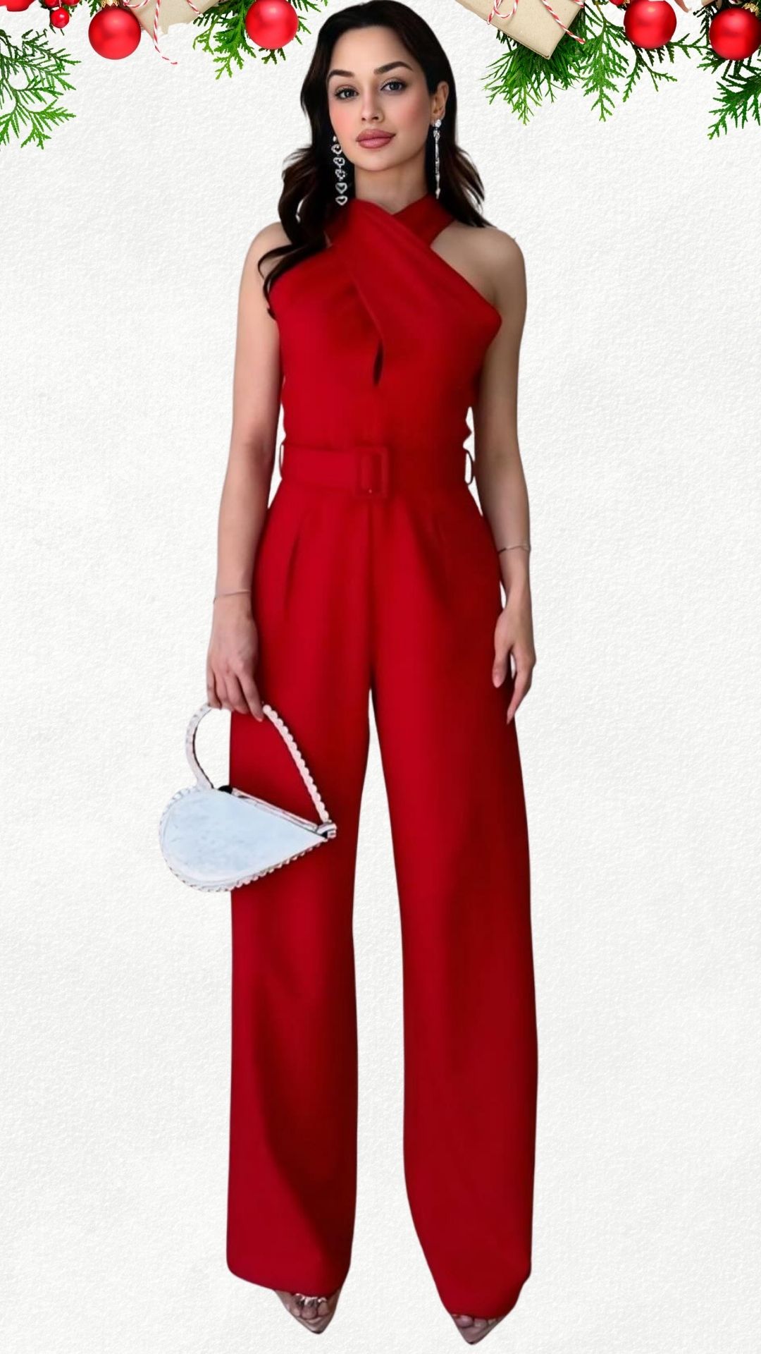 Christmas Party Outfit With a Vibrant Red Halter Jumpsuit