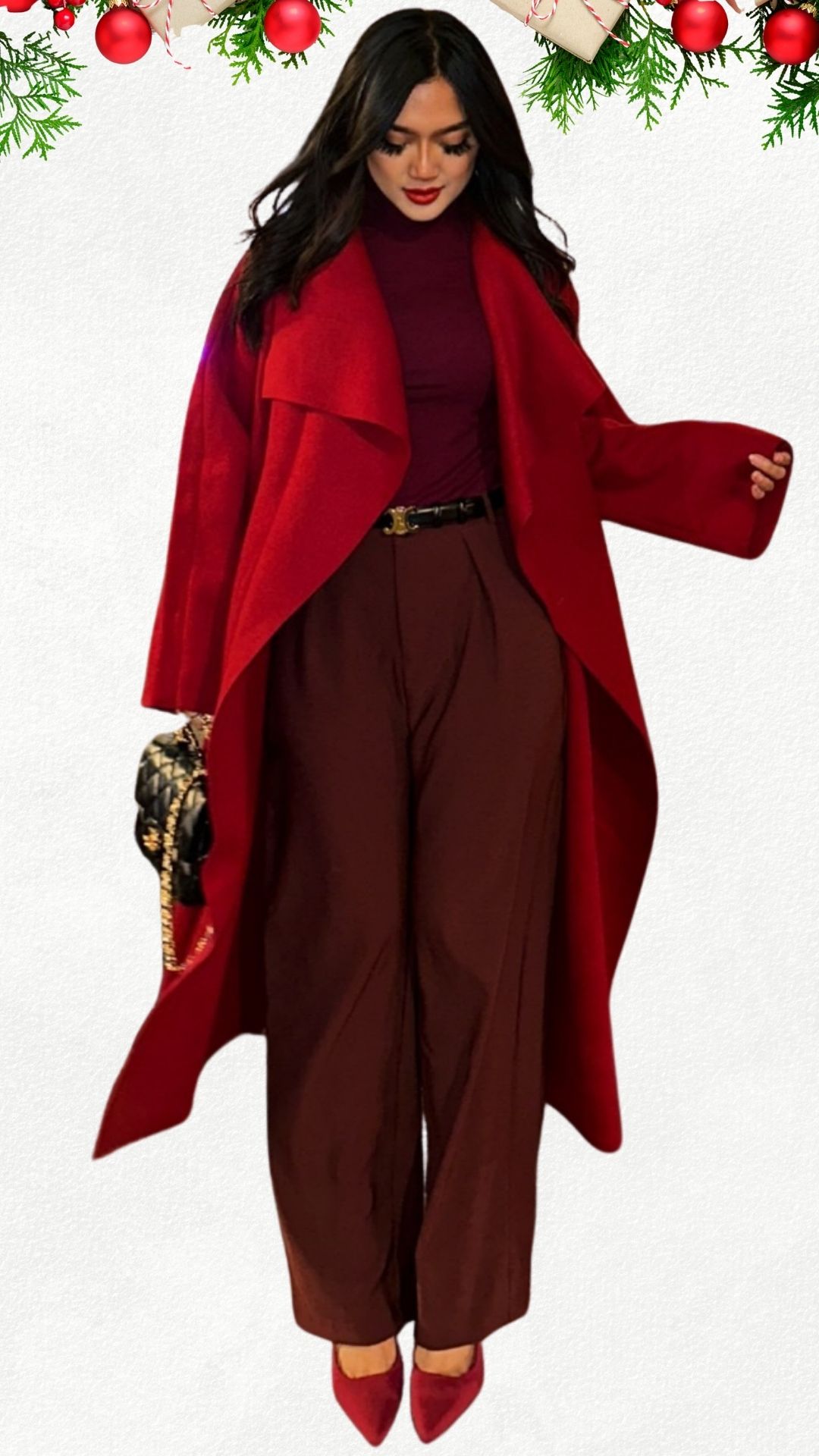 This striking outfit features a vibrant red overcoat that drapes elegantly over a fitted burgundy turtleneck, creating a rich and textured look.