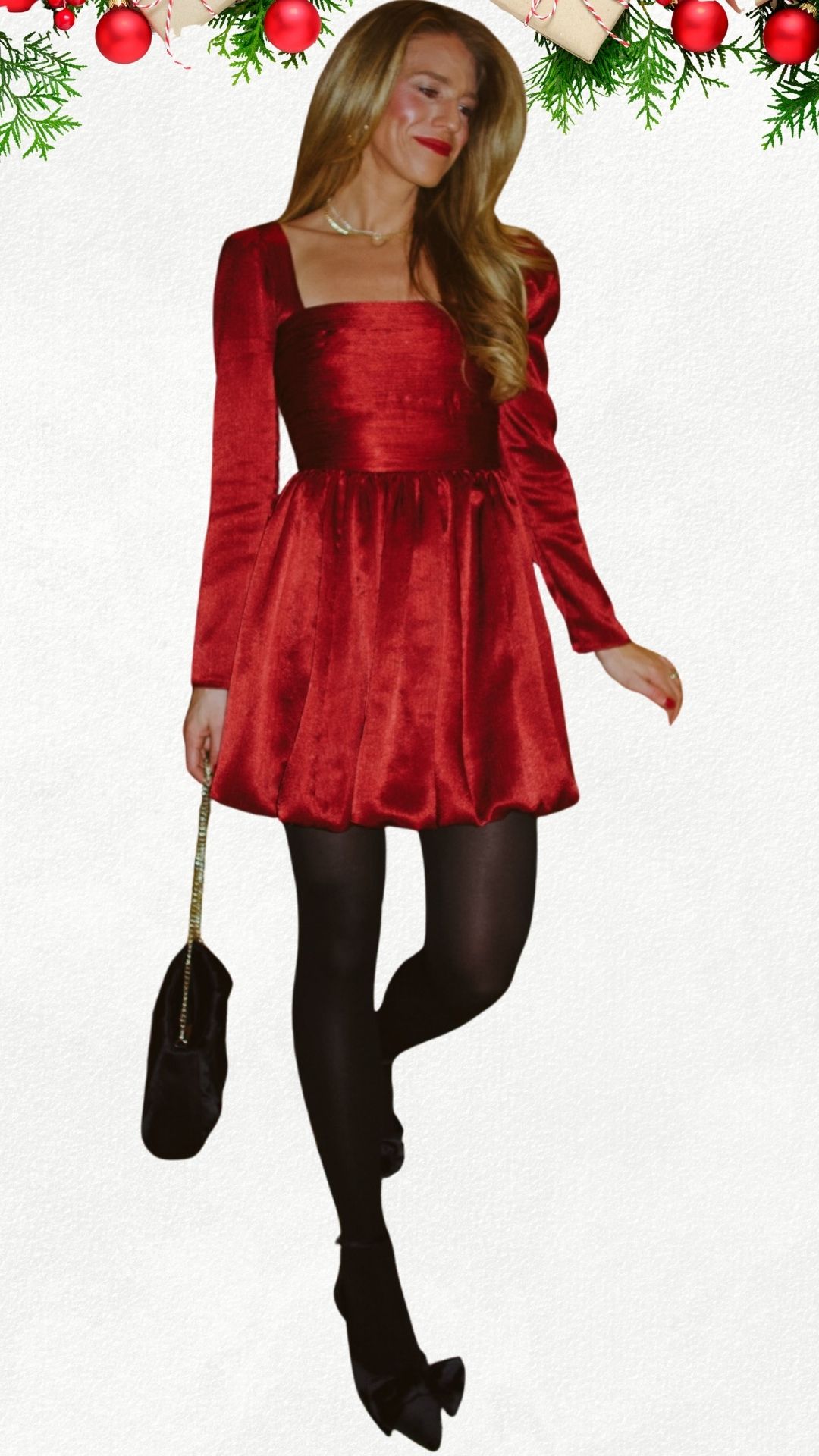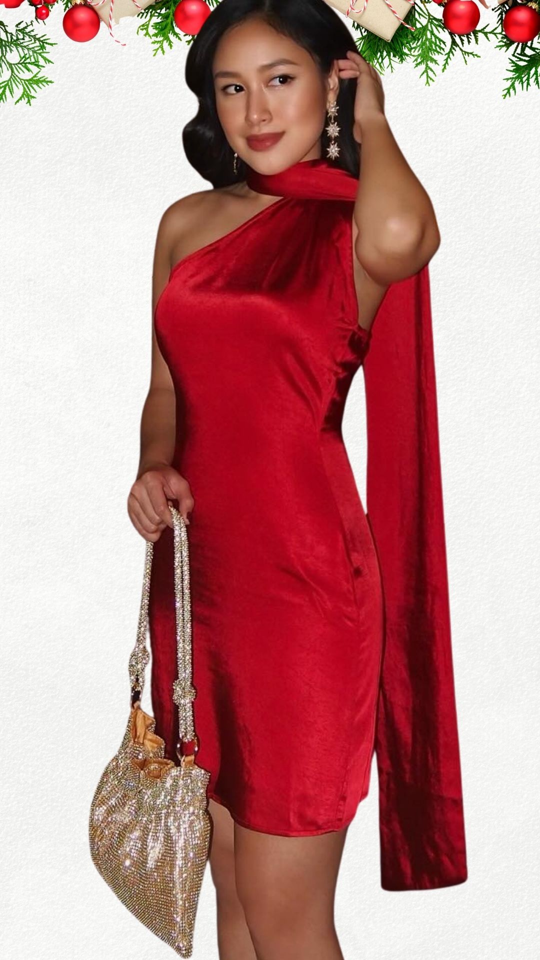 This elegant holiday outfit showcases a form-fitting red mini dress that radiates confidence.