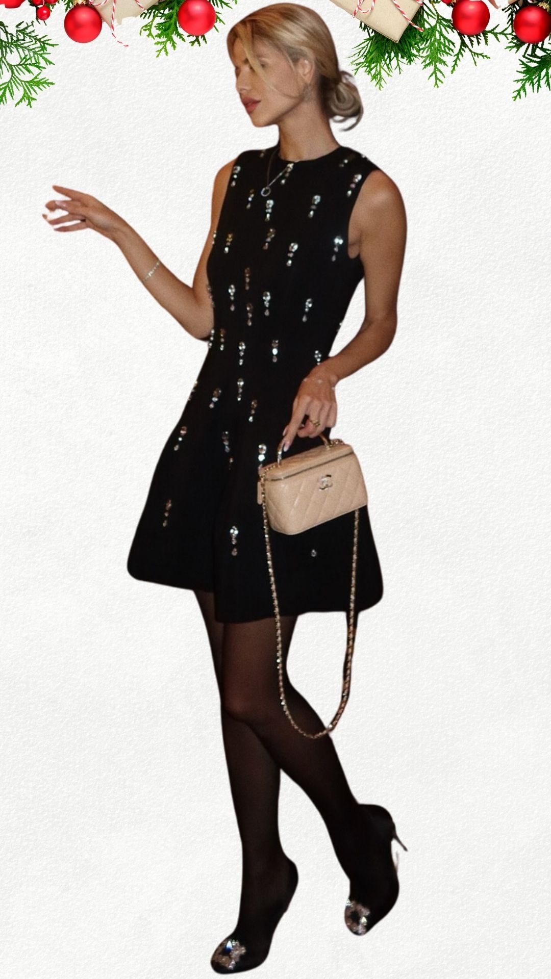 This stunning outfit features a sleeveless black dress, its sequined fabric catching the light beautifully, making it perfect for festive gatherings.