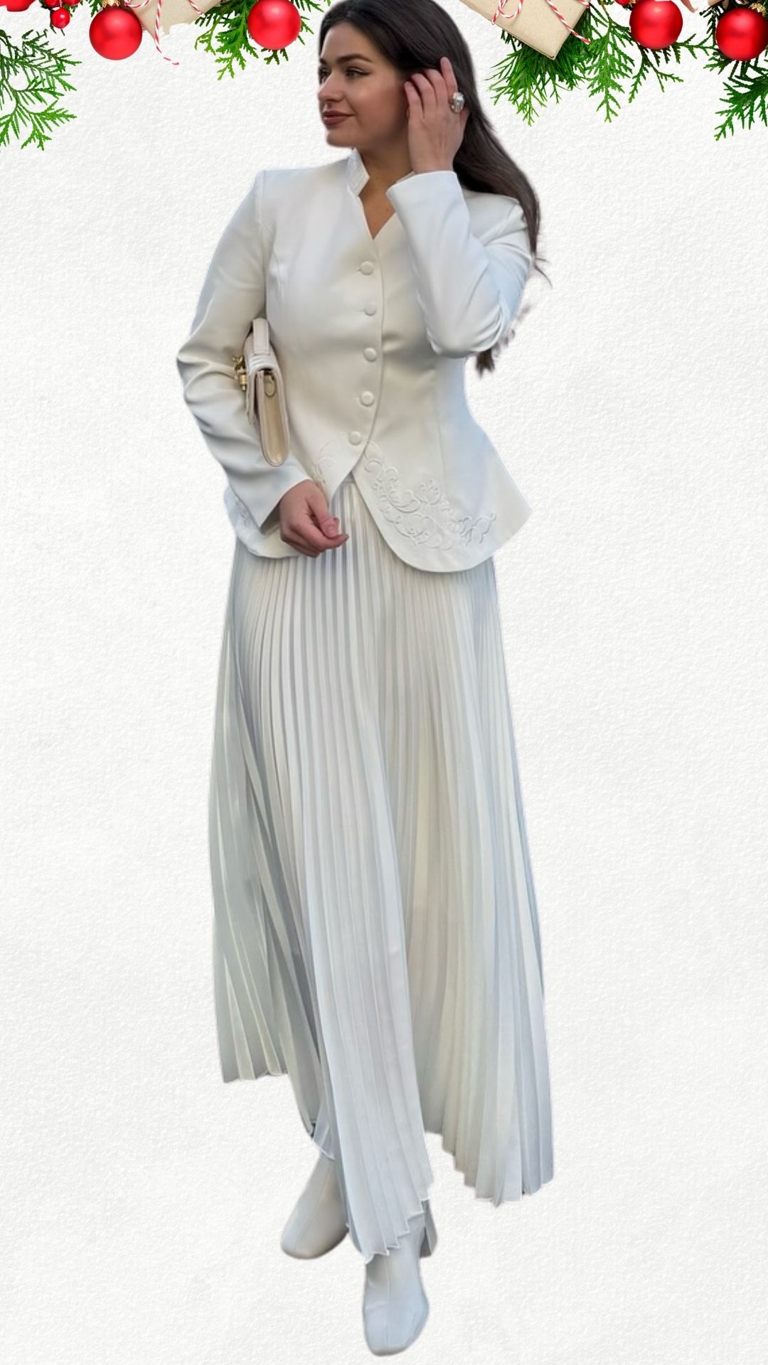 This sophisticated outfit pairs a tailored white blazer adorned with decorative buttons with a flowing, floor-length white skirt, exuding an air of refinement.