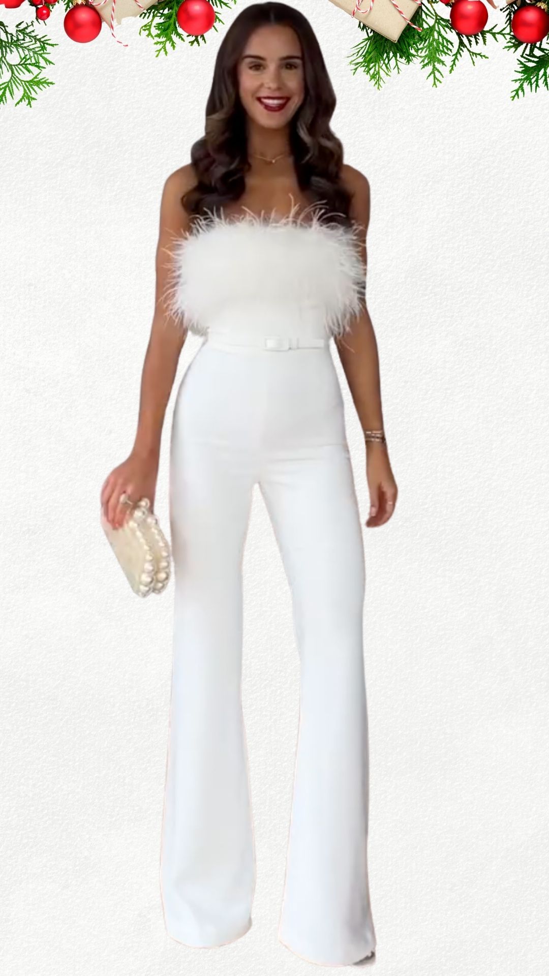 This stunning white strapless jumpsuit features a luxurious feathered bodice that adds whimsical texture to its sleek design.