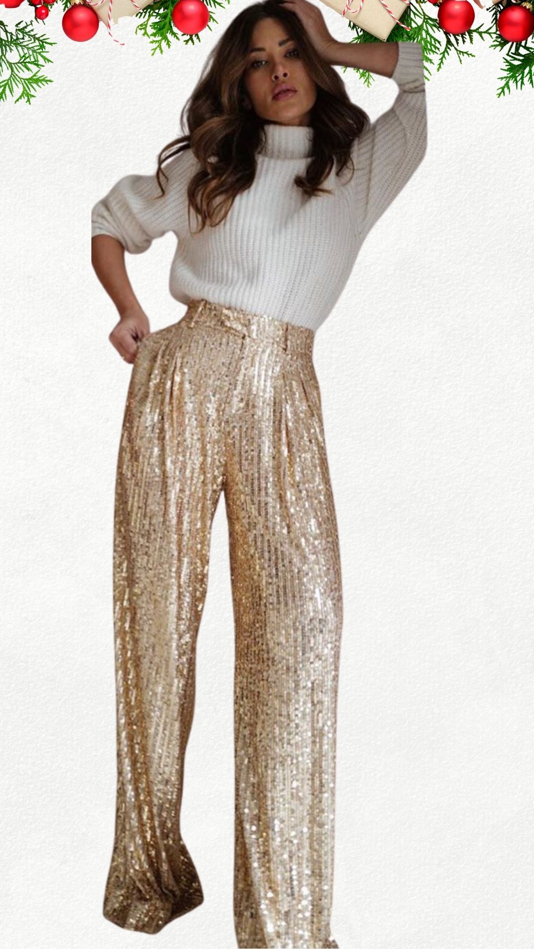 Christmas Party Outfit With Eye-Catching Gold Sequined Trousers