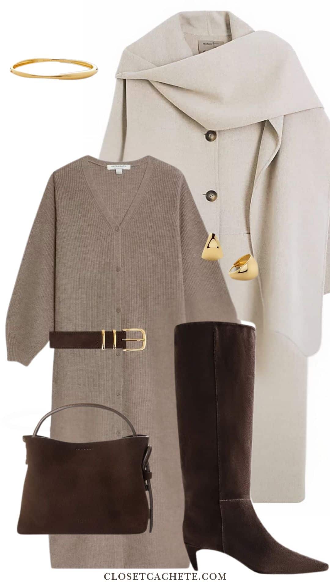 This sophisticated ensemble is highlighted by a soft beige coat featuring a draped collar, perfectly layered over a cozy, light brown knitted cardigan.