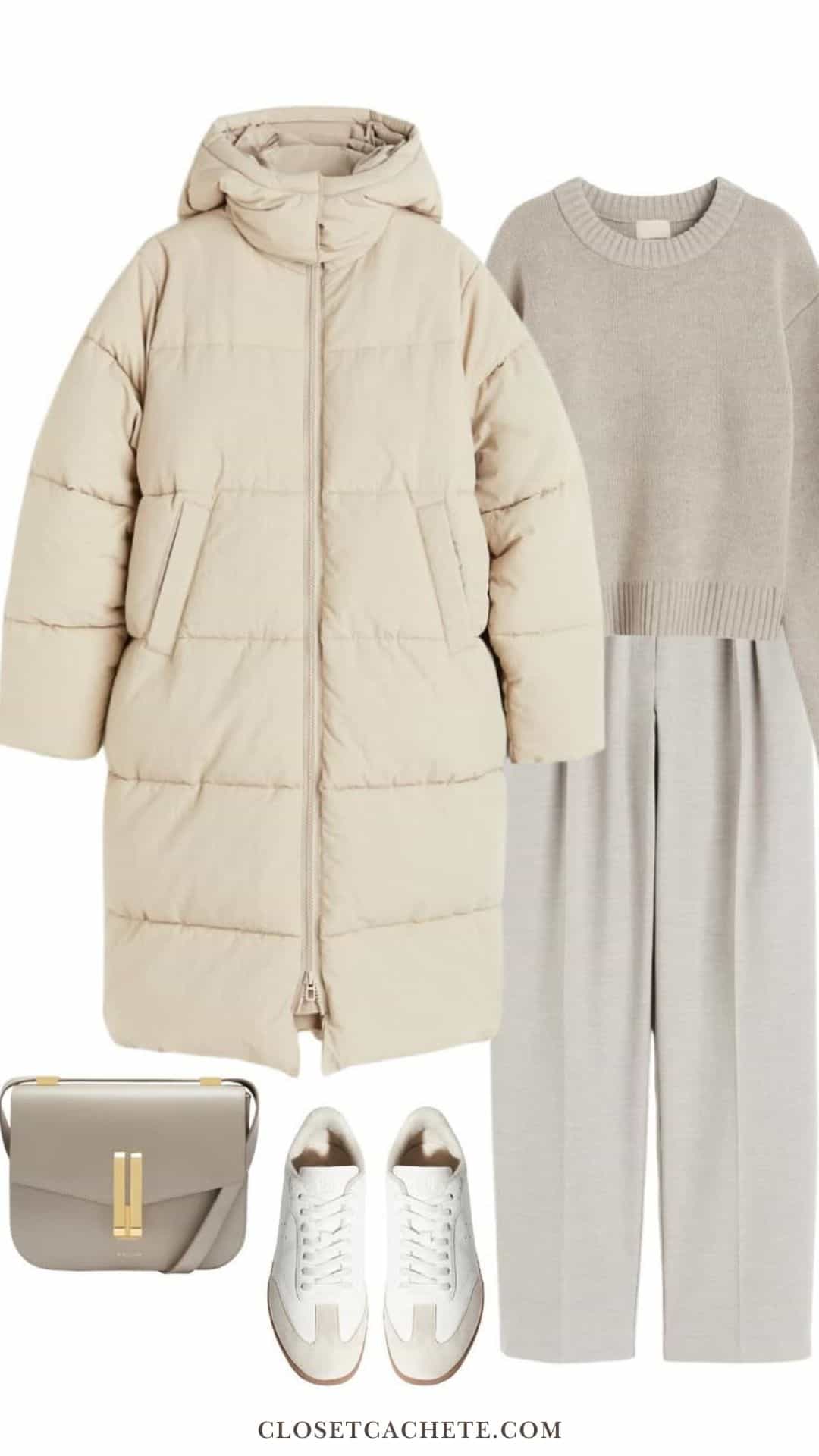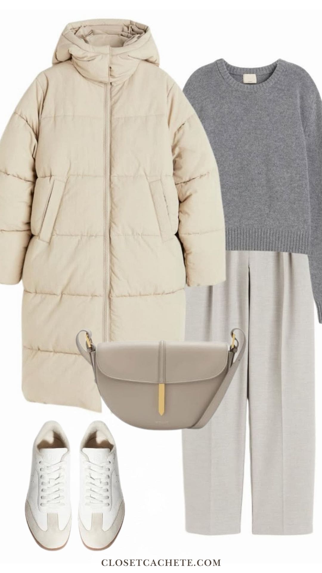 This outfit showcases a stylish blend of comfort and sophistication, featuring a beige puffer coat that adds warmth and a modern edge.