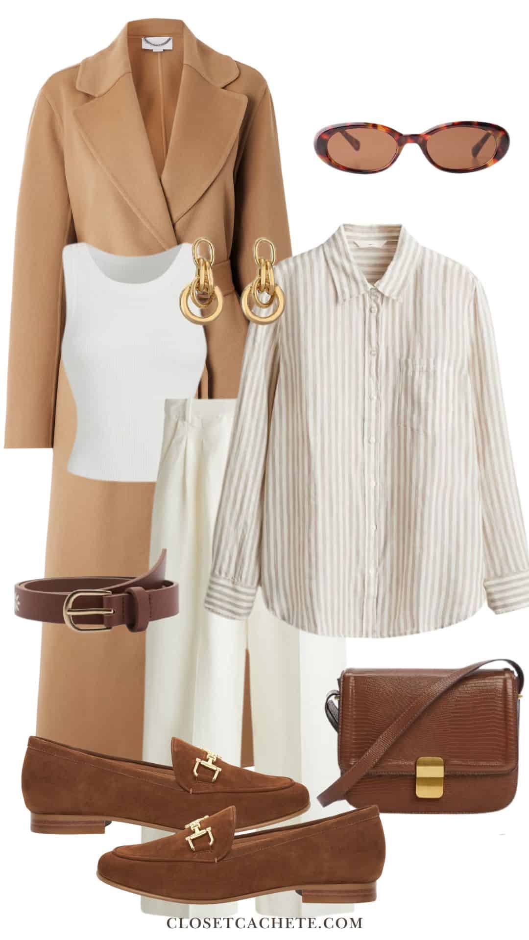 The fitted white tank top and light beige striped button-up shirt provide a clean and stylish base, complemented by cream wide-leg trousers that enhance the silhouette.