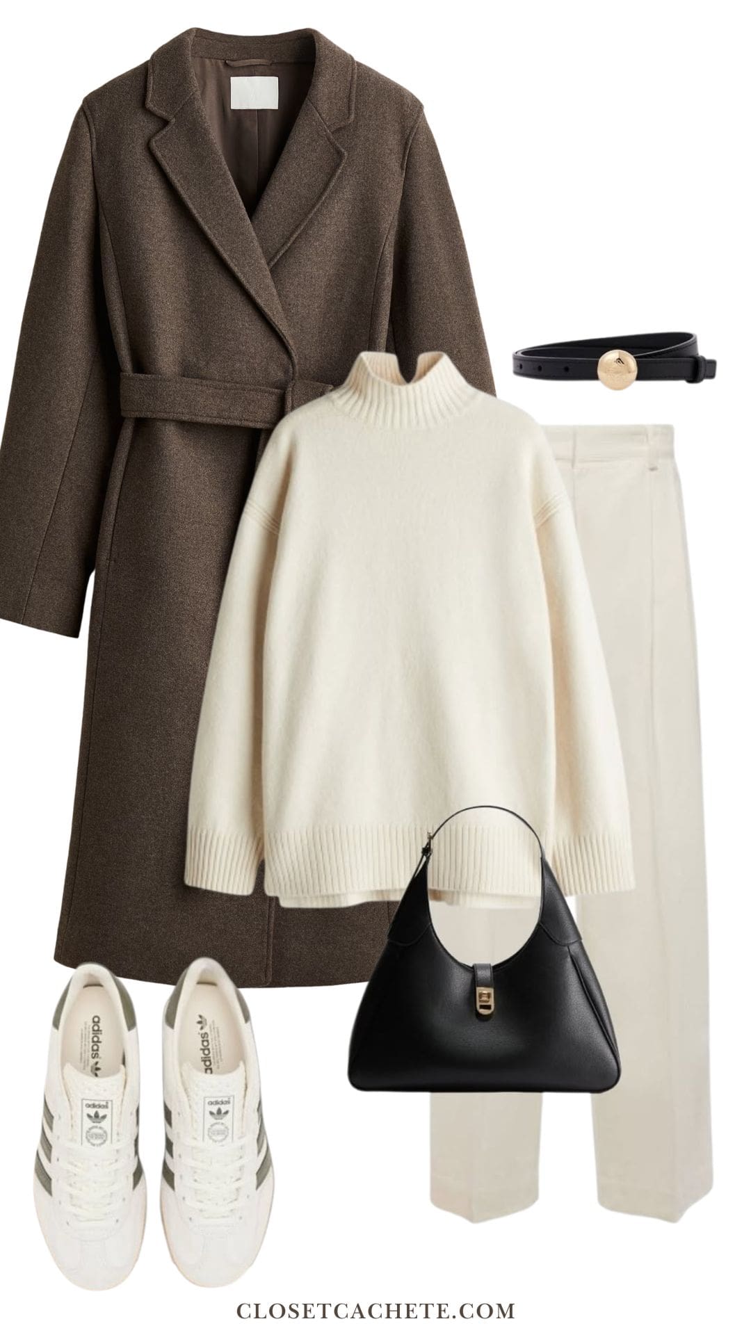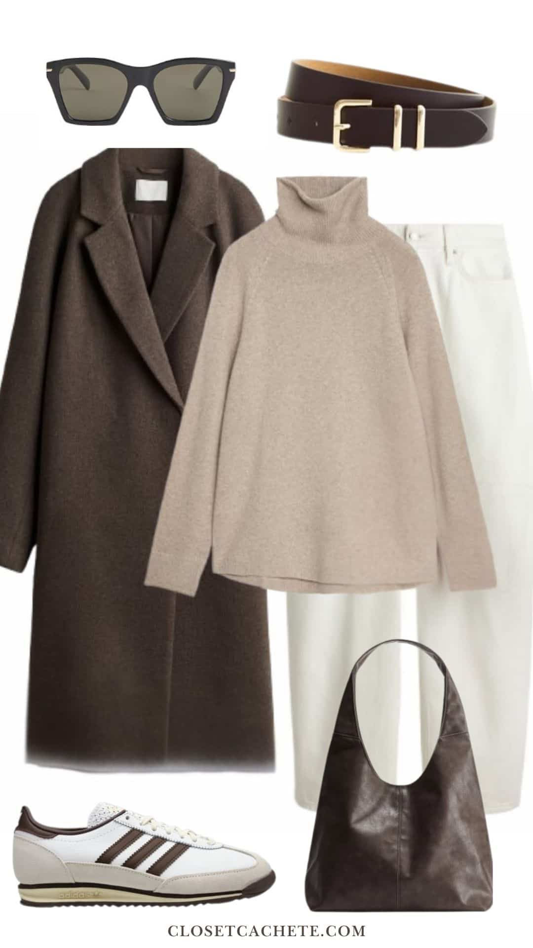 This elegant outfit features a long, dark brown overcoat that instantly elevates any ensemble. The light beige turtleneck sweater underneath adds a cozy, yet refined touch, perfectly paired with off-white high-waisted pants that enhance the silhouette.