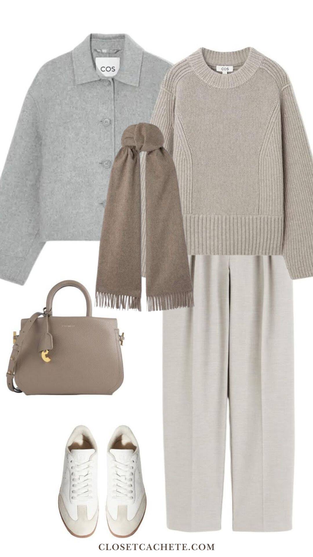 Accessorized with a light brown scarf and a stylish taupe handbag, this outfit balances comfort with high-end fashion.