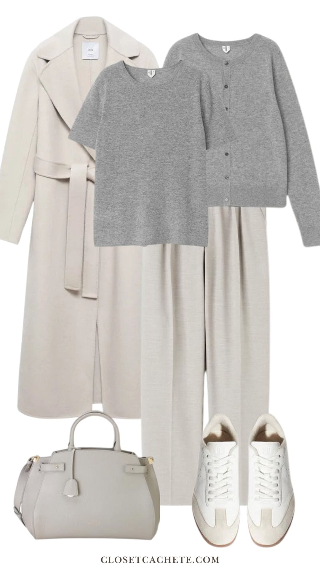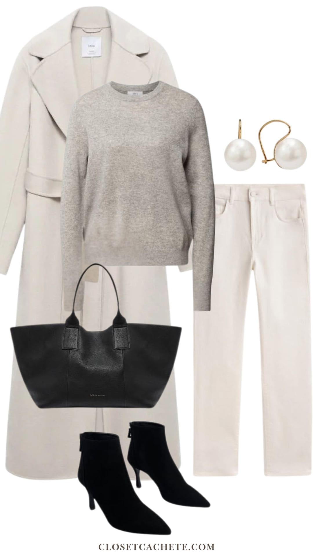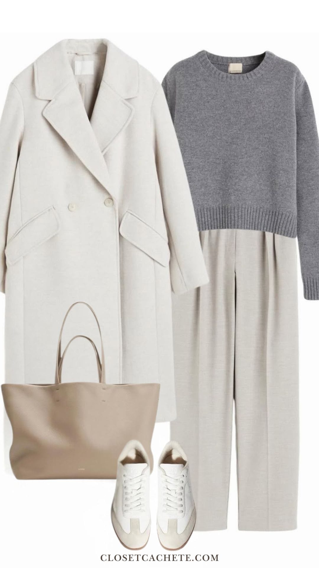 The sophisticated gray double-breasted coat exudes a timeless appeal while providing warmth and structure. Underneath, a soft cream knit sweater adds a touch of coziness, balancing out the outer layer.
