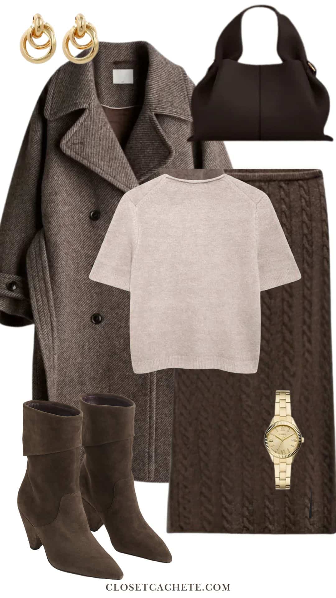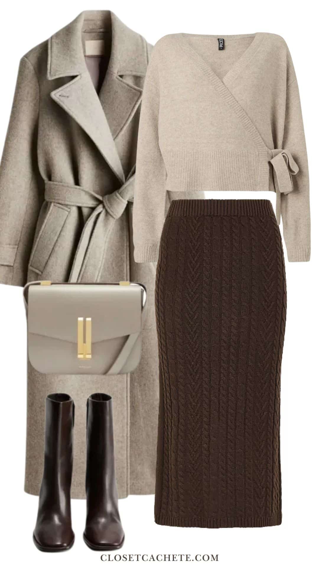 The light beige wrap sweater with a tie detail creates a flattering silhouette, while the textured brown midi skirt adds depth with its cable knit pattern.