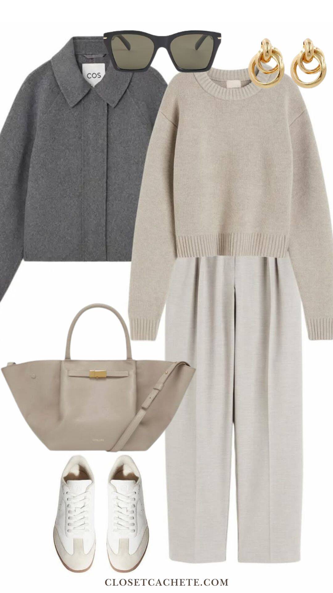 This chic ensemble features a soft gray cropped jacket that exudes sophistication and warmth, perfect for transitional seasons.