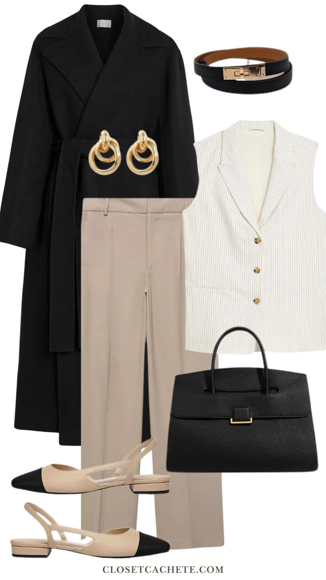 Pairing this outfit with black slung-back flats featuring a beige toe and a classic black handbag amplifies its chic essence.