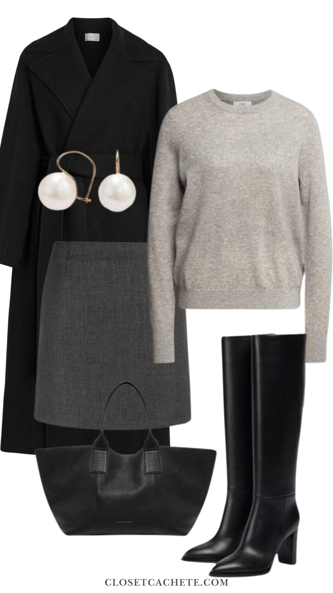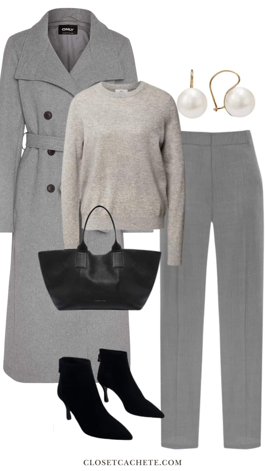 This sophisticated outfit encapsulates the essence of elegance, featuring a long grey trench coat that effortlessly layers over a light grey sweater.