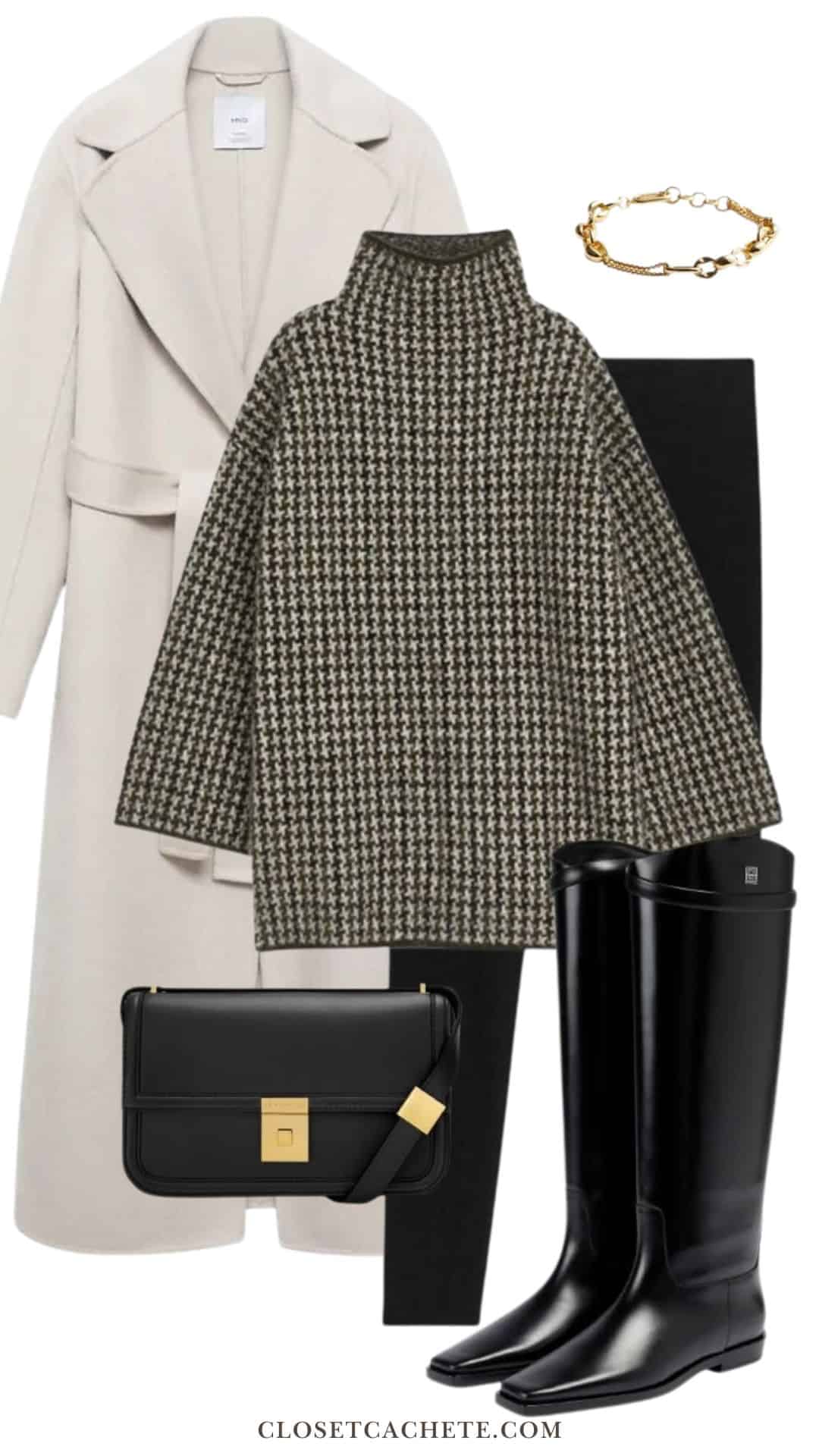 Underneath, the patterned high-neck sweater features a classic houndstooth design in muted tones, creating a timeless appeal.