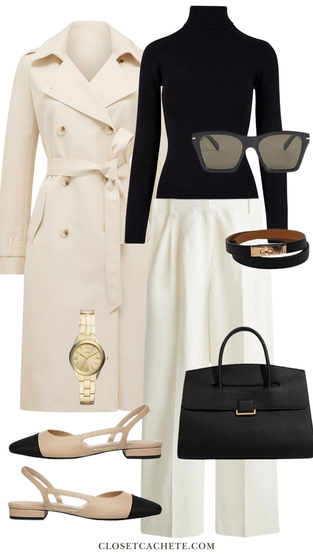 This stylish ensemble exudes sophistication and elegance. The light beige trench coat serves as a perfect layering piece, providing a crisp yet relaxed silhouette.
