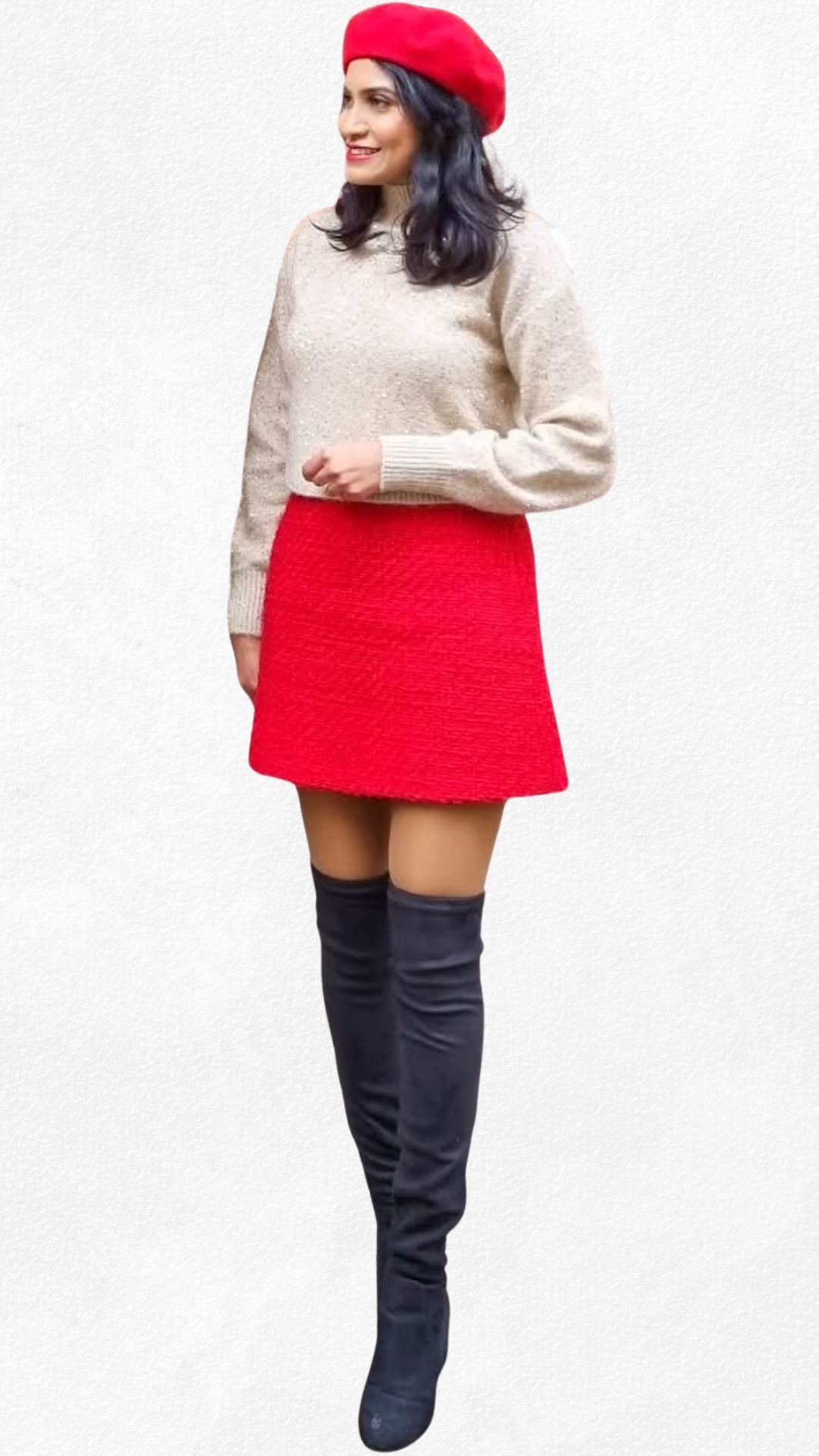 Knee-high black boots and a vibrant red beret enhance the outfit, showcasing a trendy flair that elevates casual wear.