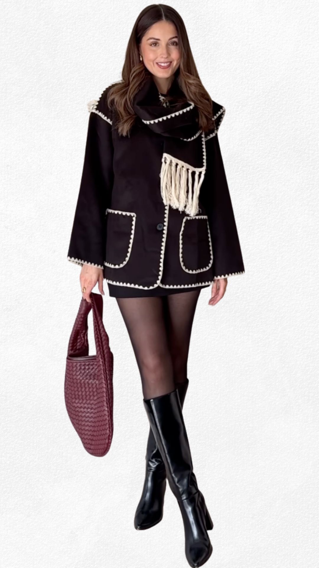This chic Christmas outfit showcases a beautifully tailored black coat, adorned with cream fringe detailing that adds a playful touch.