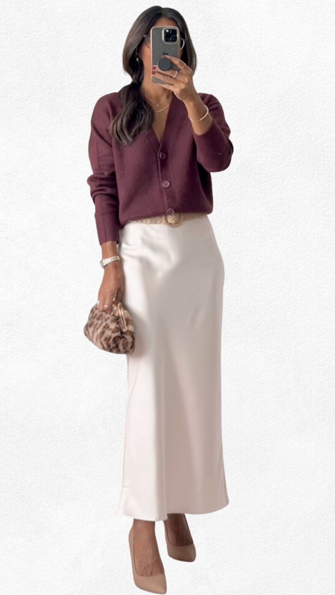 Paired with a sleek ivory satin maxi skirt, it creates a striking contrast that flows beautifully, perfect for holiday gatherings.