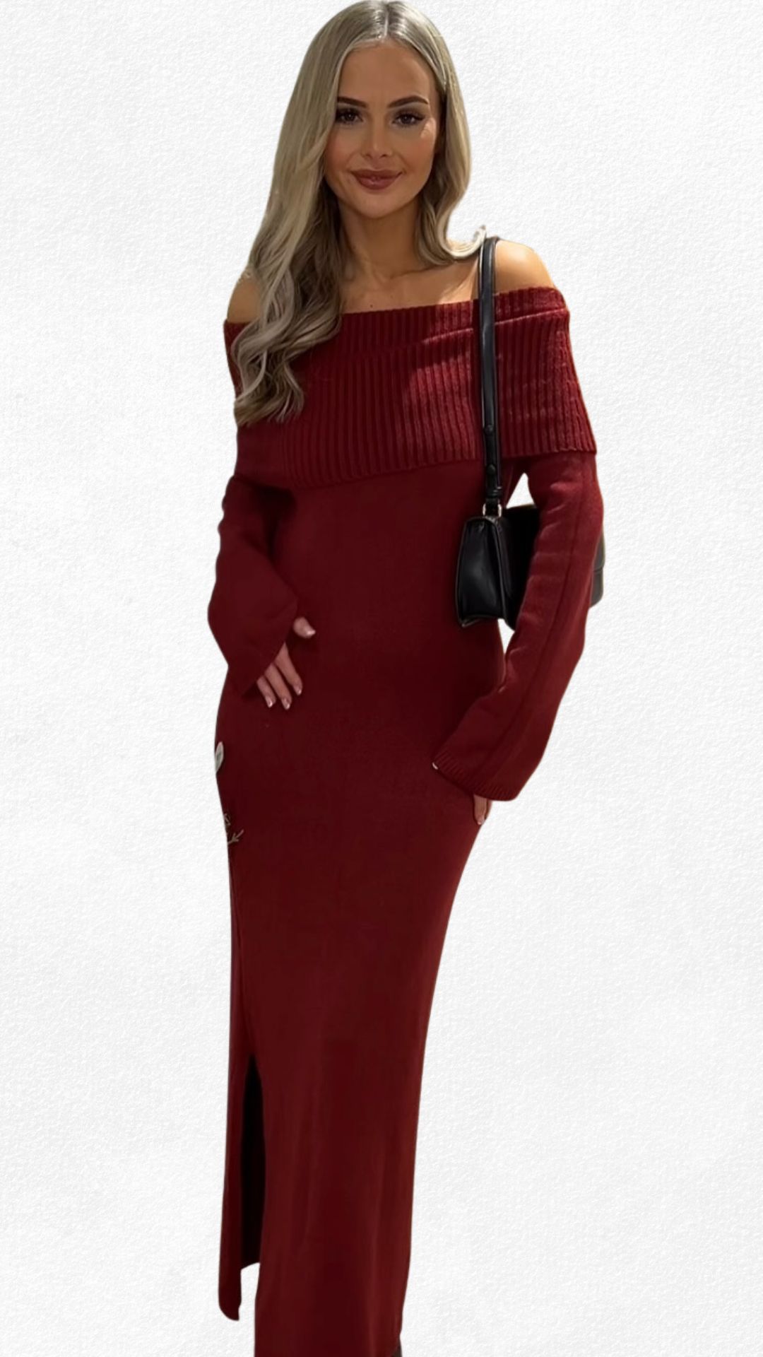 This stunning burgundy knit dress hugs the figure beautifully while offering a sophisticated off-the-shoulder design.