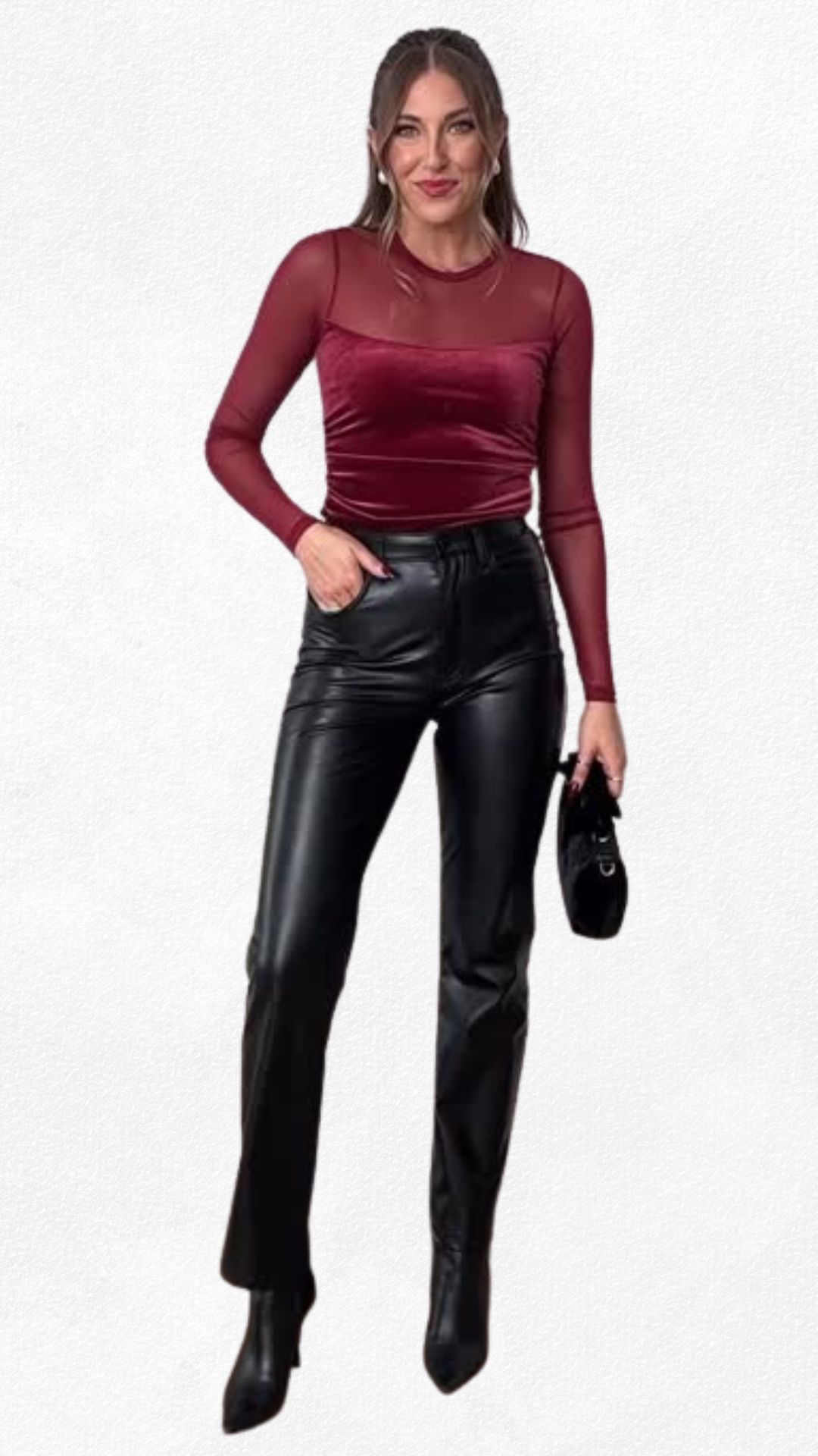 This chic holiday ensemble features a fitted burgundy long-sleeve mesh top that beautifully highlights the figure.