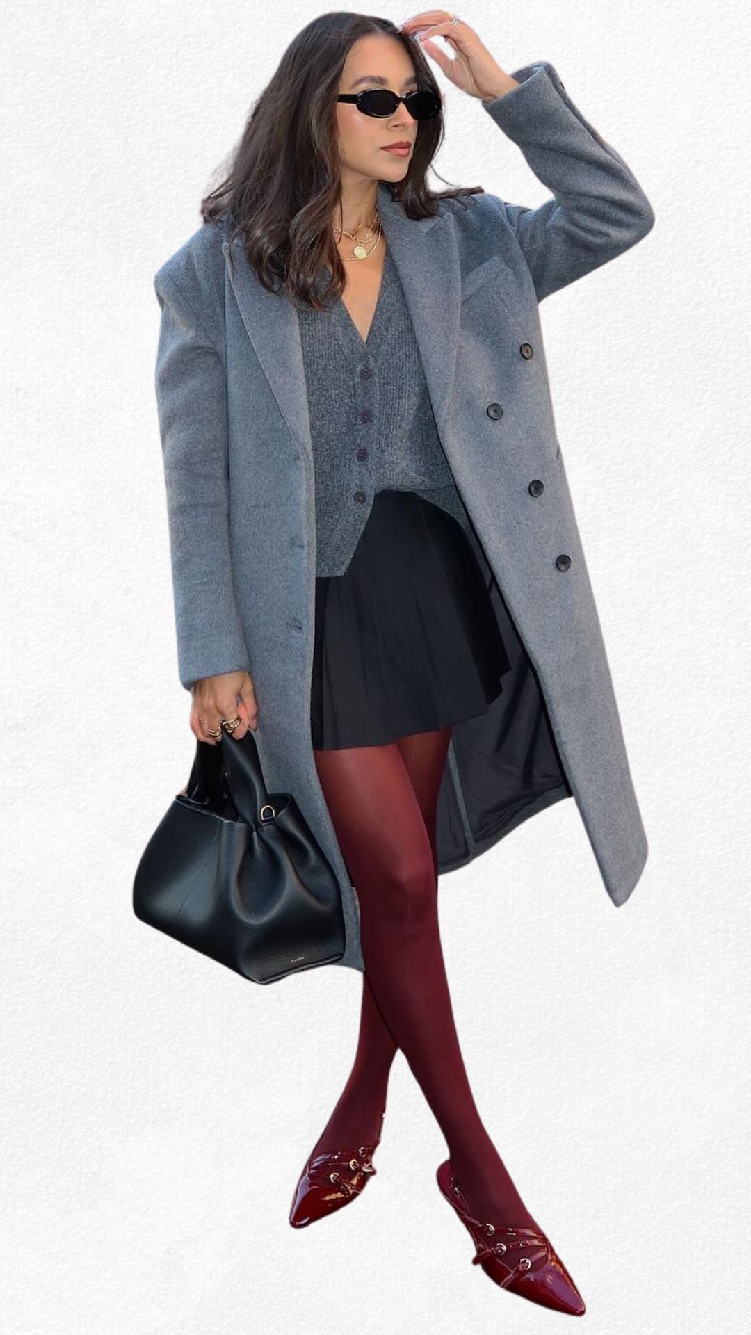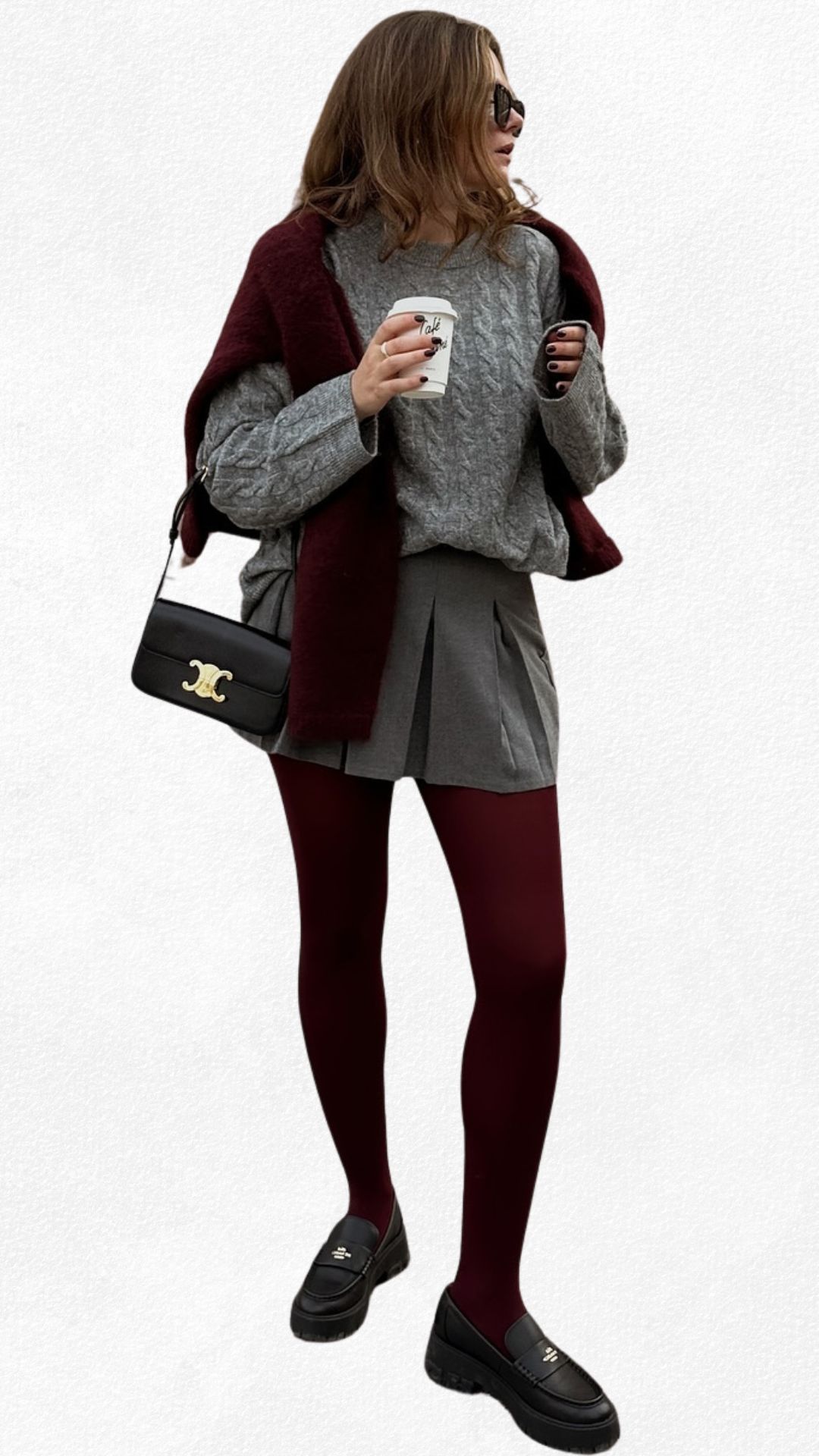 The pleated gray mini skirt brings an element of playful sophistication, and when paired with the stylish burgundy tights and chunky black loafers, the look radiates holiday cheer.