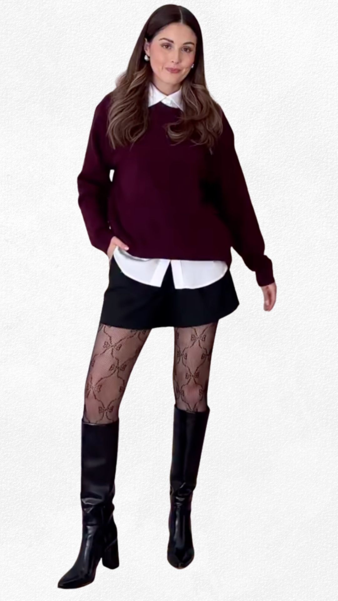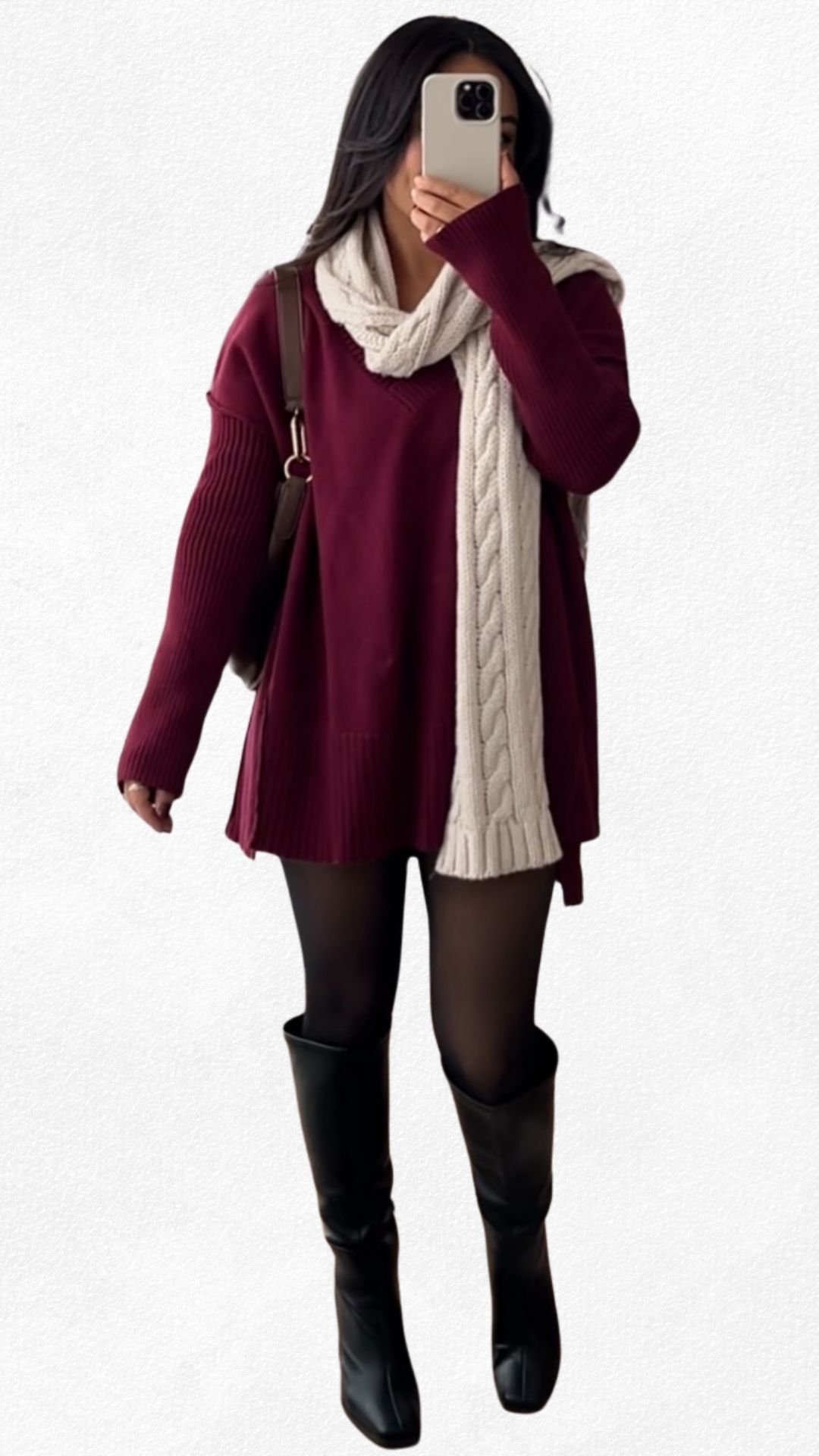 This cozy outfit combines elegance and warmth, perfect for festive gatherings. The deep burgundy oversized knit sweater features ribbed sleeves, complementing the flattering black opaque tights.