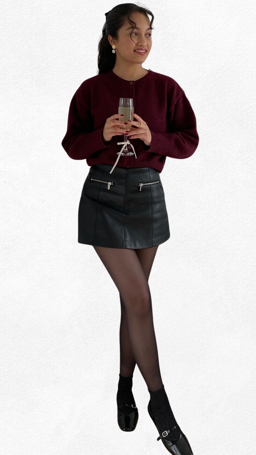 Paired with a flared black mini skirt, the ensemble is both fun and flirty. Maroon tights and glossy red pointed-toe heels elevate the look, making it a standout choice for holiday celebrations.
